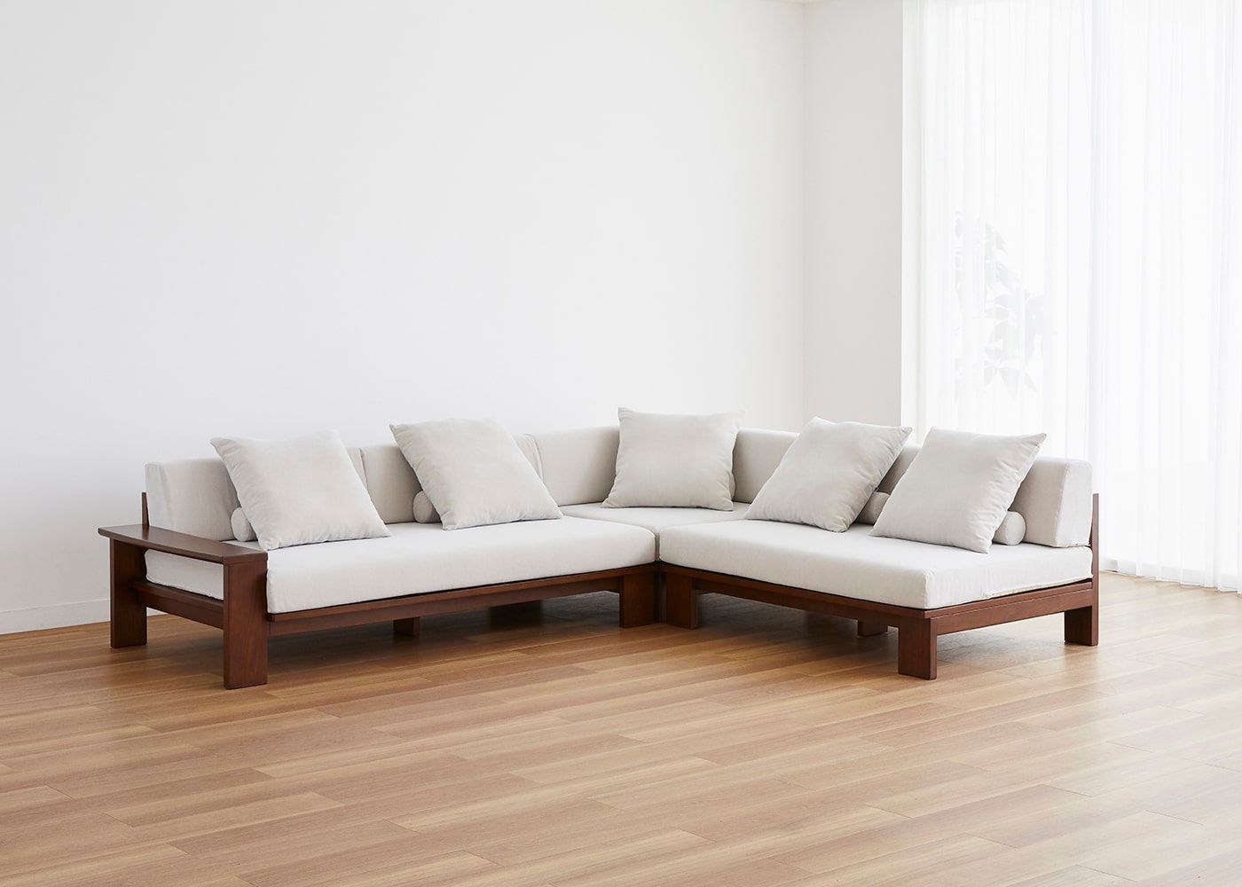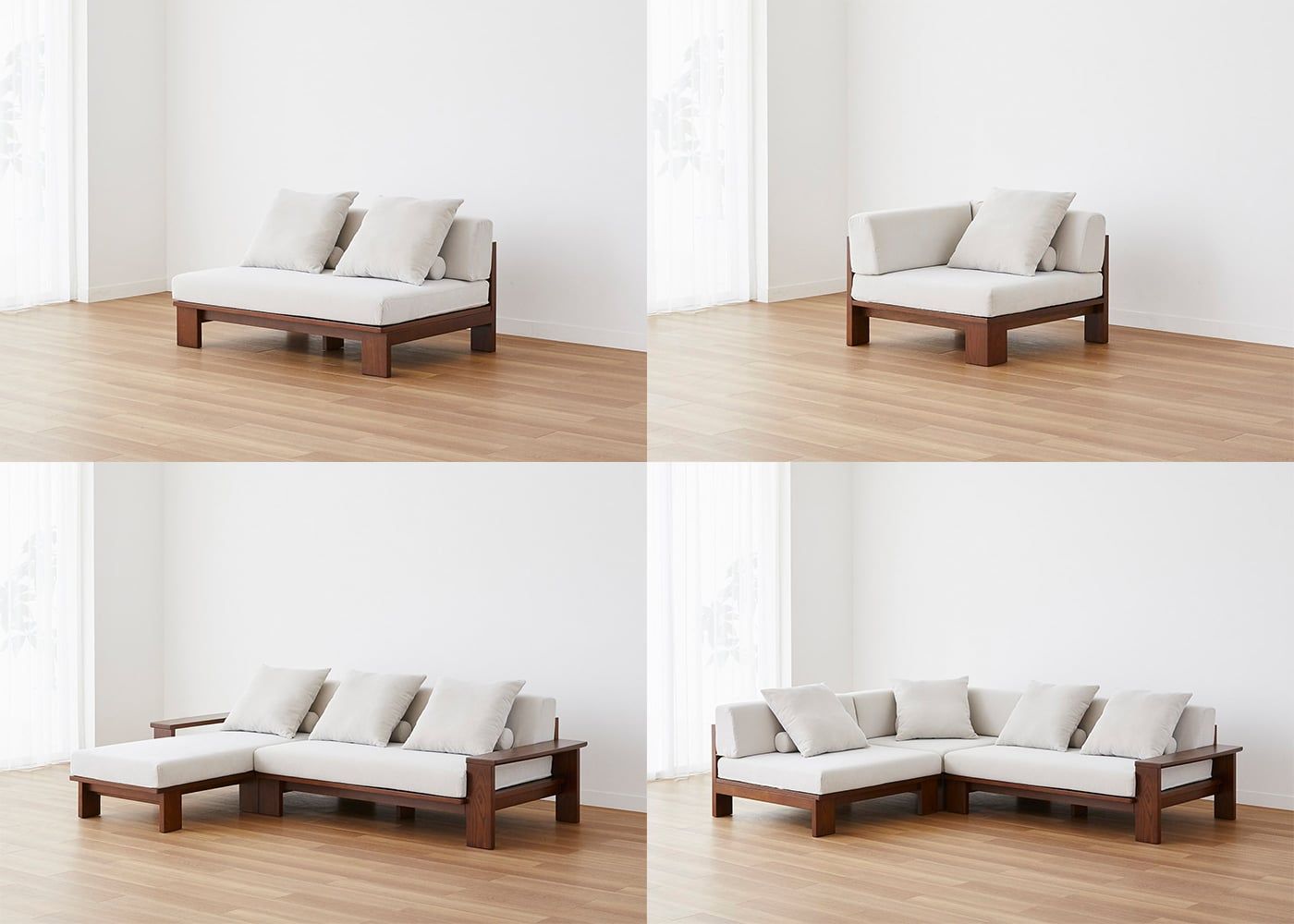 2.5人掛けベンチに専用アームと1.5人掛けベンチを追加すれば、L字ソファに拡張可能。部屋のサイズやライフステージに合わせて長く使えるセイル・ローソファをお楽しみください。(写真はv04コーナーソファセット 2.5P右アームに拡張した例)