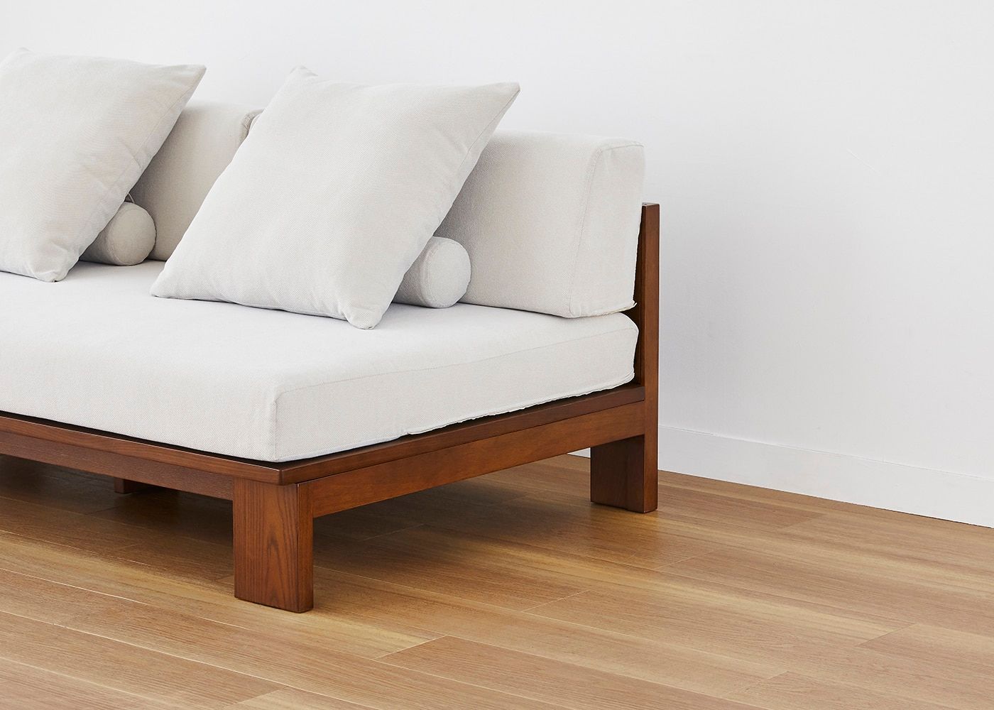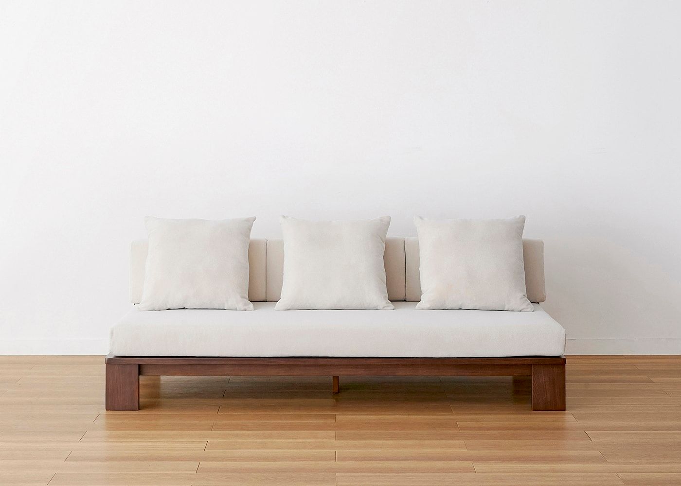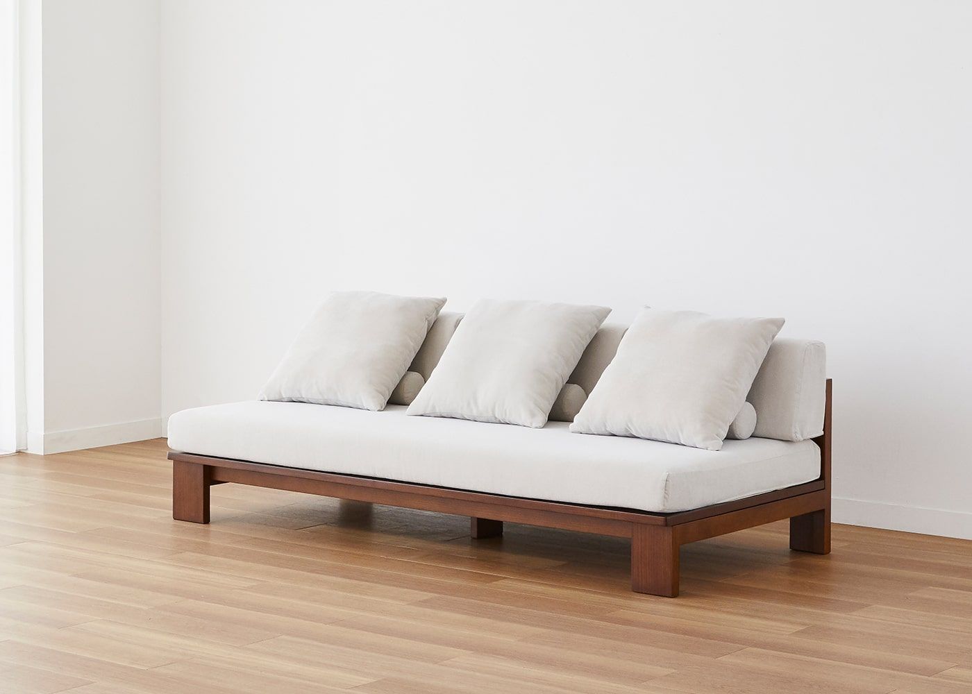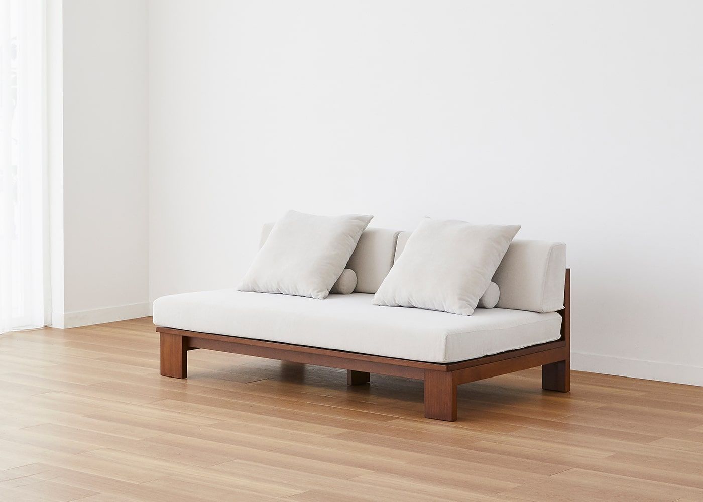 無垢材のフレームと肘掛けのないアームレスな構造をもつ、セイル・ローソファ ベンチ (GB)。帆船をイメージしたデザインが、空間に開放感をもたらし、広く心地よい雰囲気を演出します。≫セイル・ローソファの開発エピソードはこちら