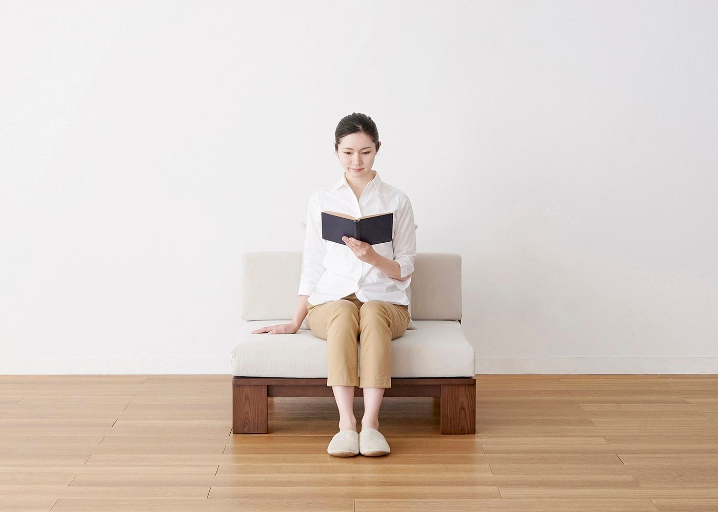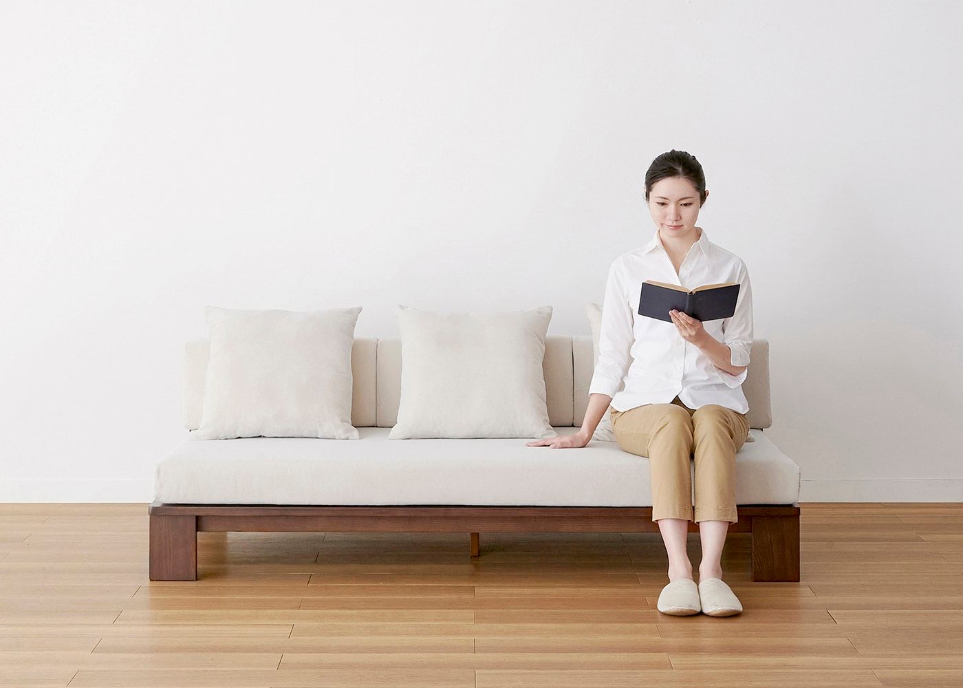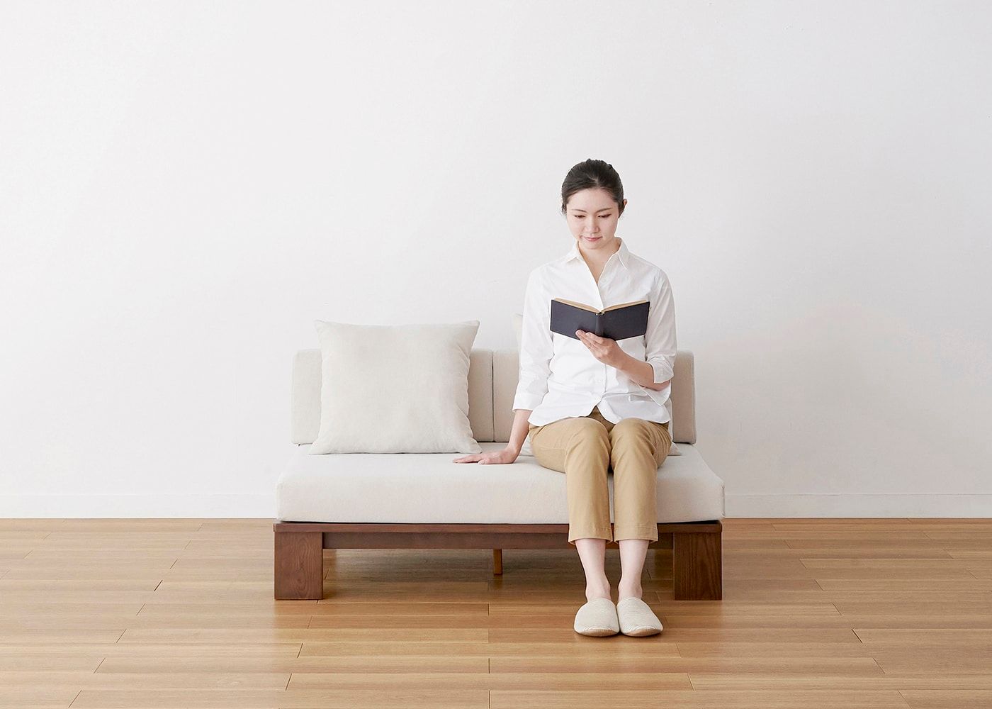 お子様がいる家庭や床で過ごす方に最適なロータイプのソファです。日本人の体型やライフスタイルに合わせたサイズ感で、ゆったりと身体を預けられる快適な座り心地を実現しています。(写真は2.5人掛け 右アーム、モデルは身長167cmの女性)