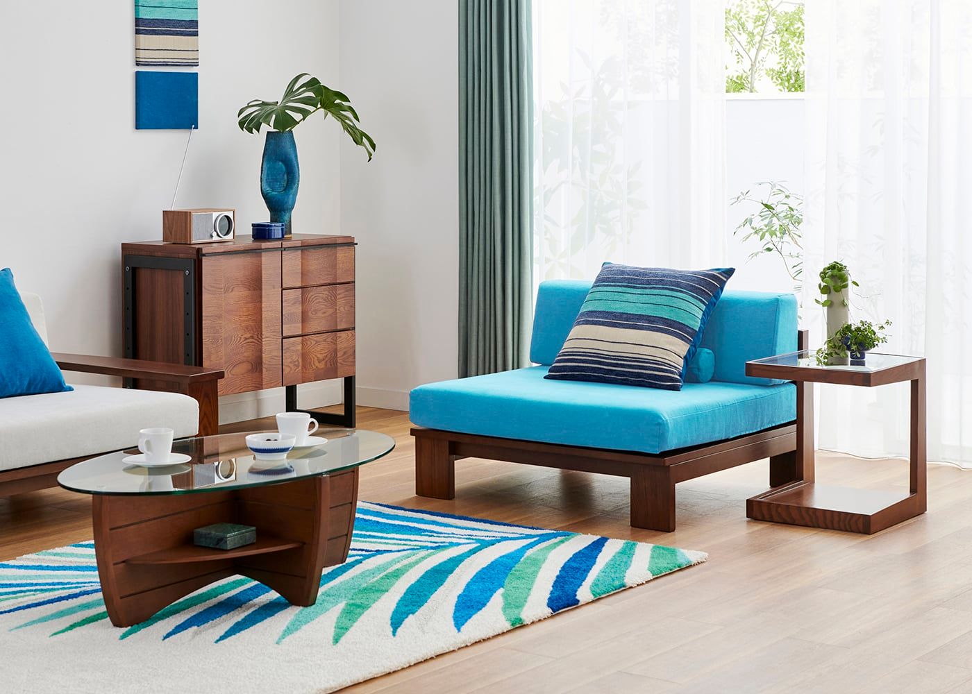 ブルー系インテリアと美しく響き合う、セイル・ローソファ。 爽やかな色合いとフォルムの抜け感が空間に軽やかさを与え、涼やかな空気感を演出します。 自由なカラーコーディネートで、お部屋を素敵に彩ってみてはいかがでしょうか。≫アイランドブルー・スタイルの詳細はこちら
