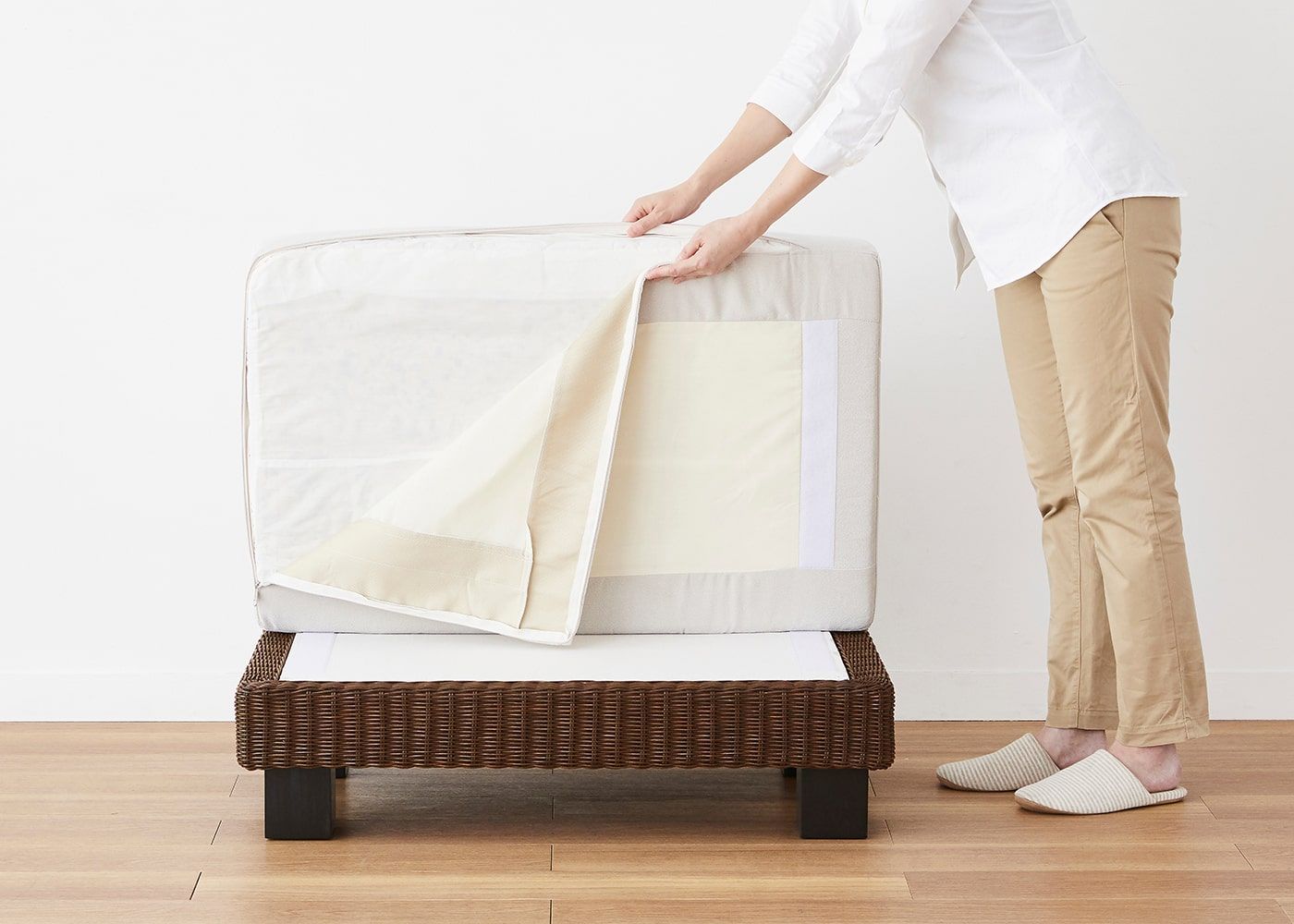 a.flatのソファはカバーの着せ替えができるのが魅力。約100色のファブリックから素材や色を選んで、あなただけのカラーコーディネートをお楽しみください。(別売、受注生産)