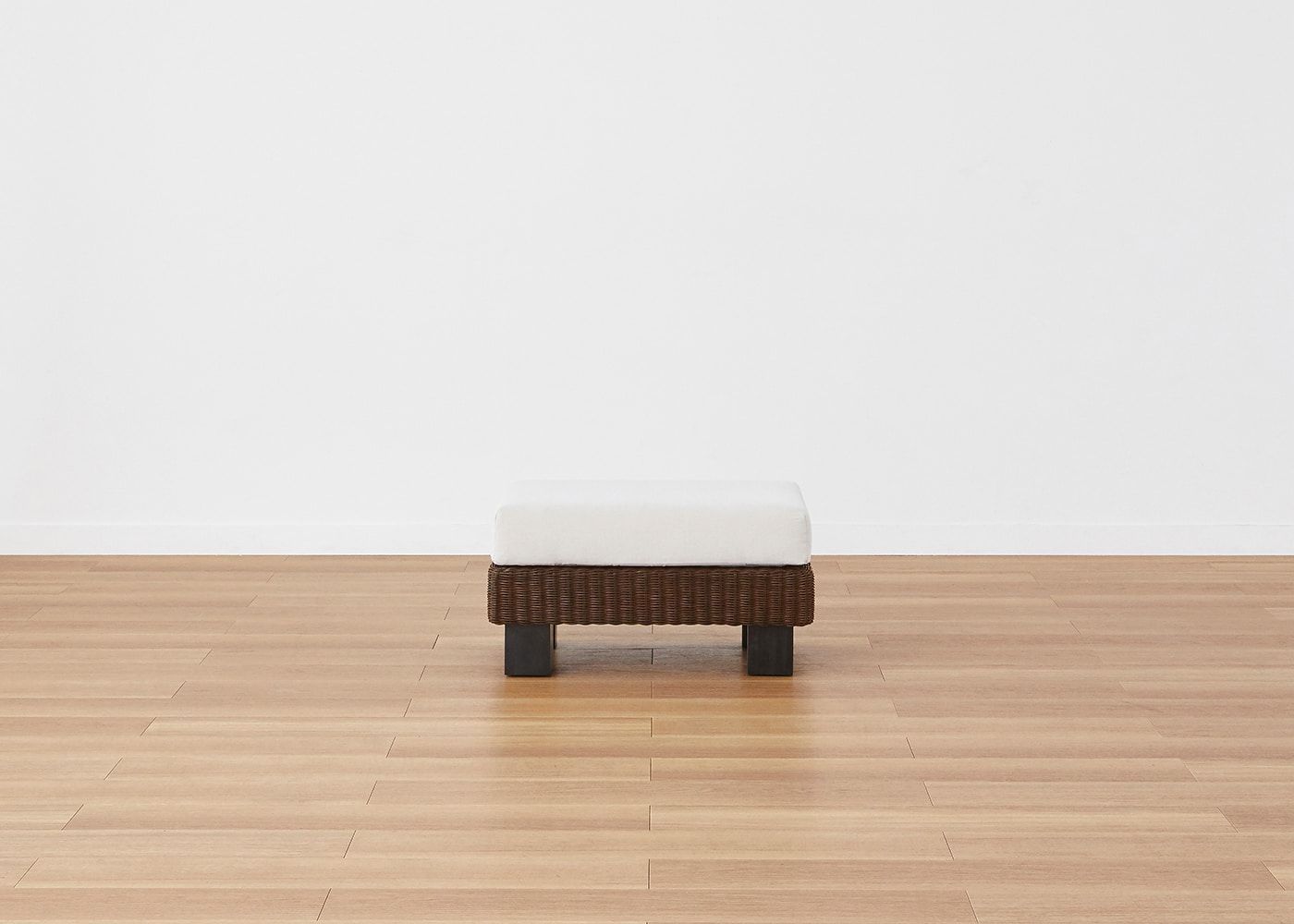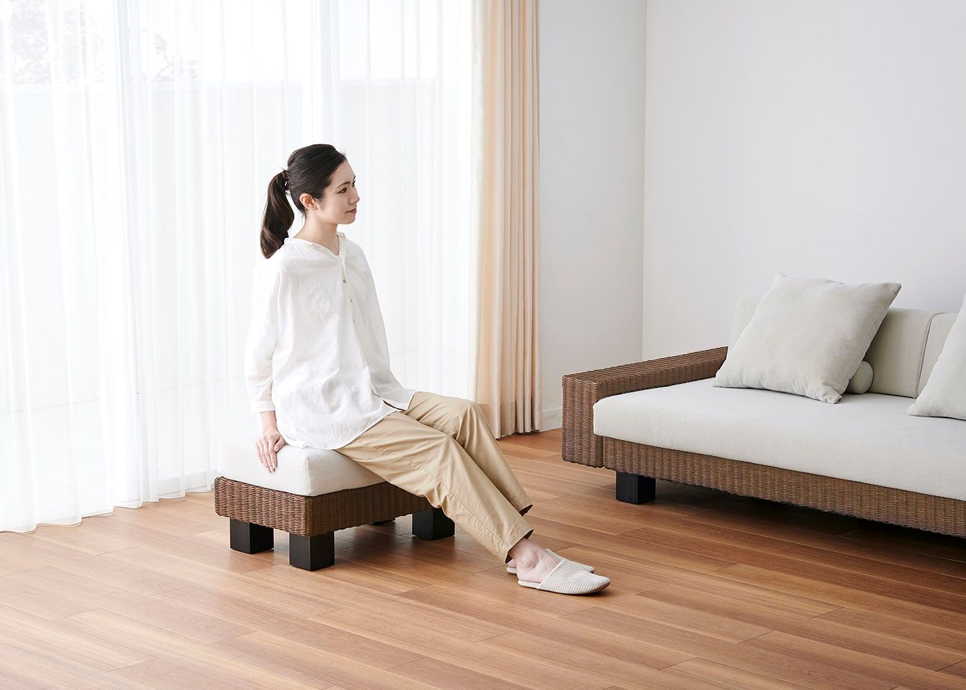 「日本人らしい床に近い暮らし」をテーマにデザインされた、ケイ・ローソファ オットマンv02 (ラタンGB)。脚を伸ばして寛いだり、どこにでも置きやすいコンパクトサイズになります。