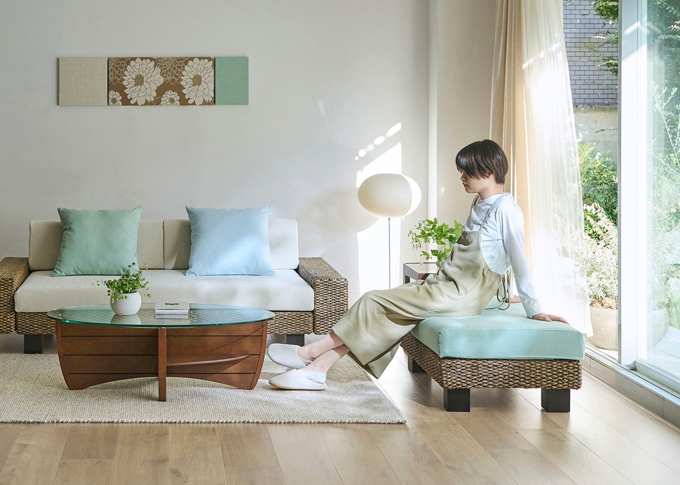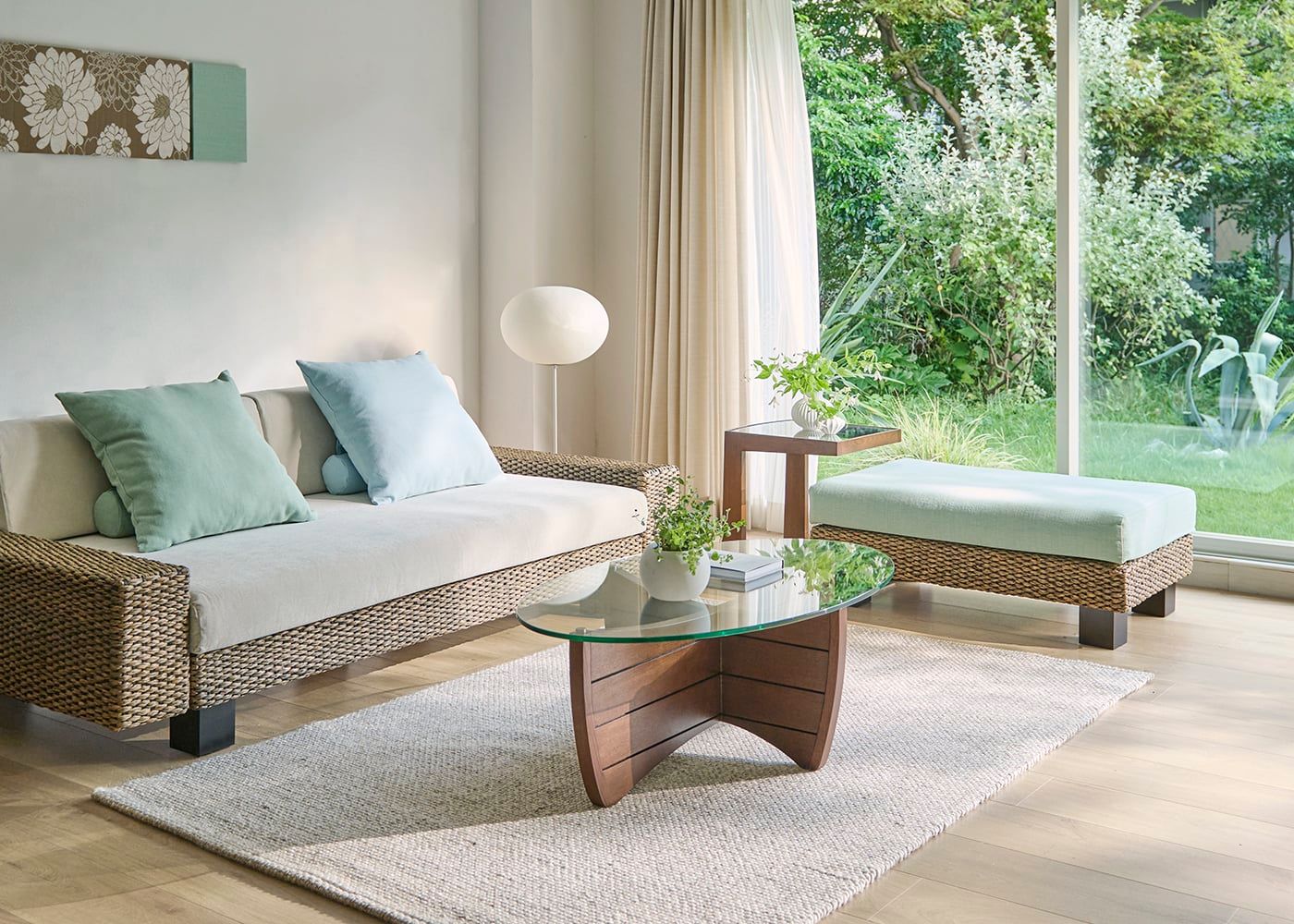 優しい印象のヒヤシンスを使用したローソファに、弧を描くガラスのローテーブルを組みました。淡いグリーンのカラーコーデとともに、穏やかな空気感に包まれたリビングで過ごせます。