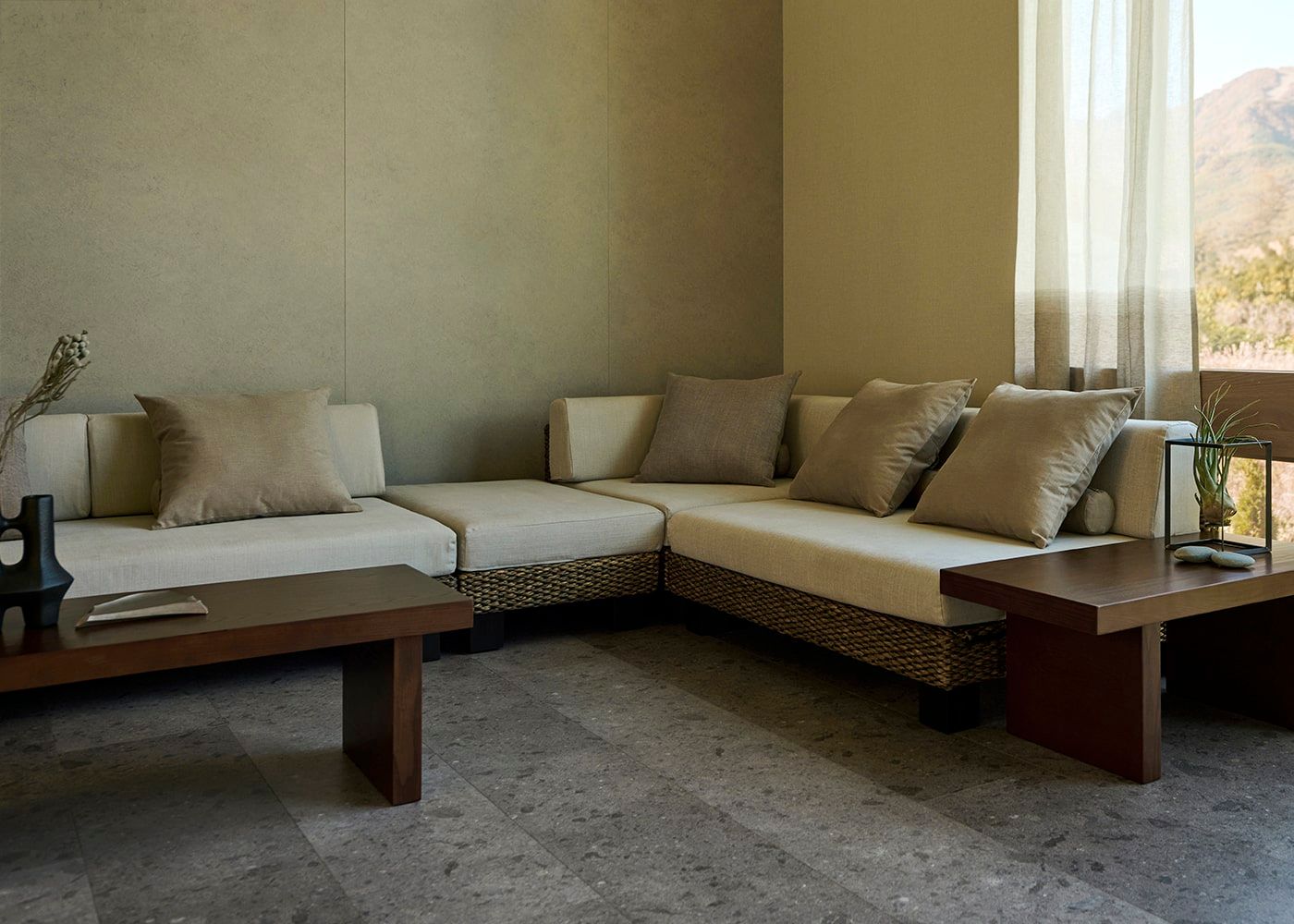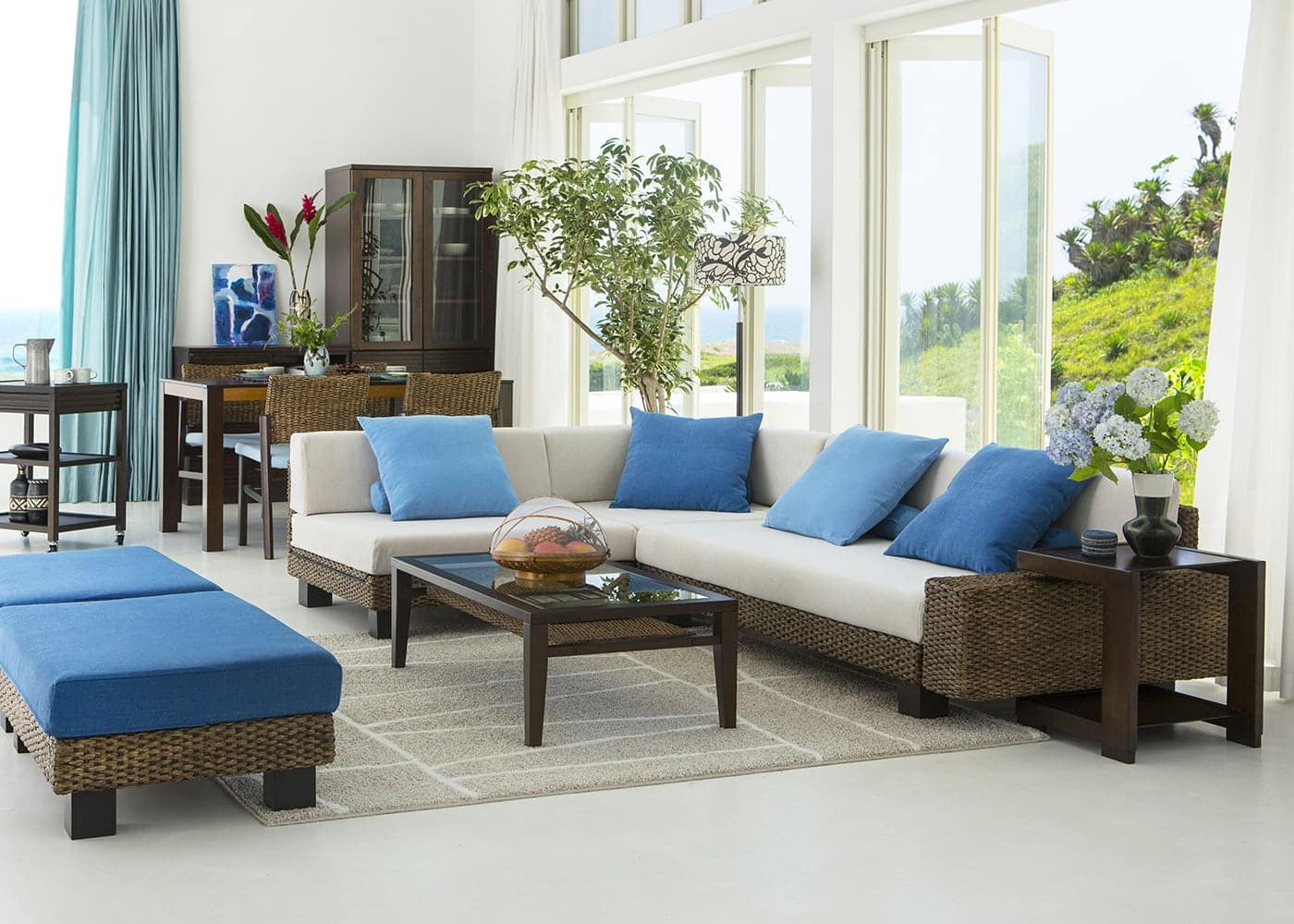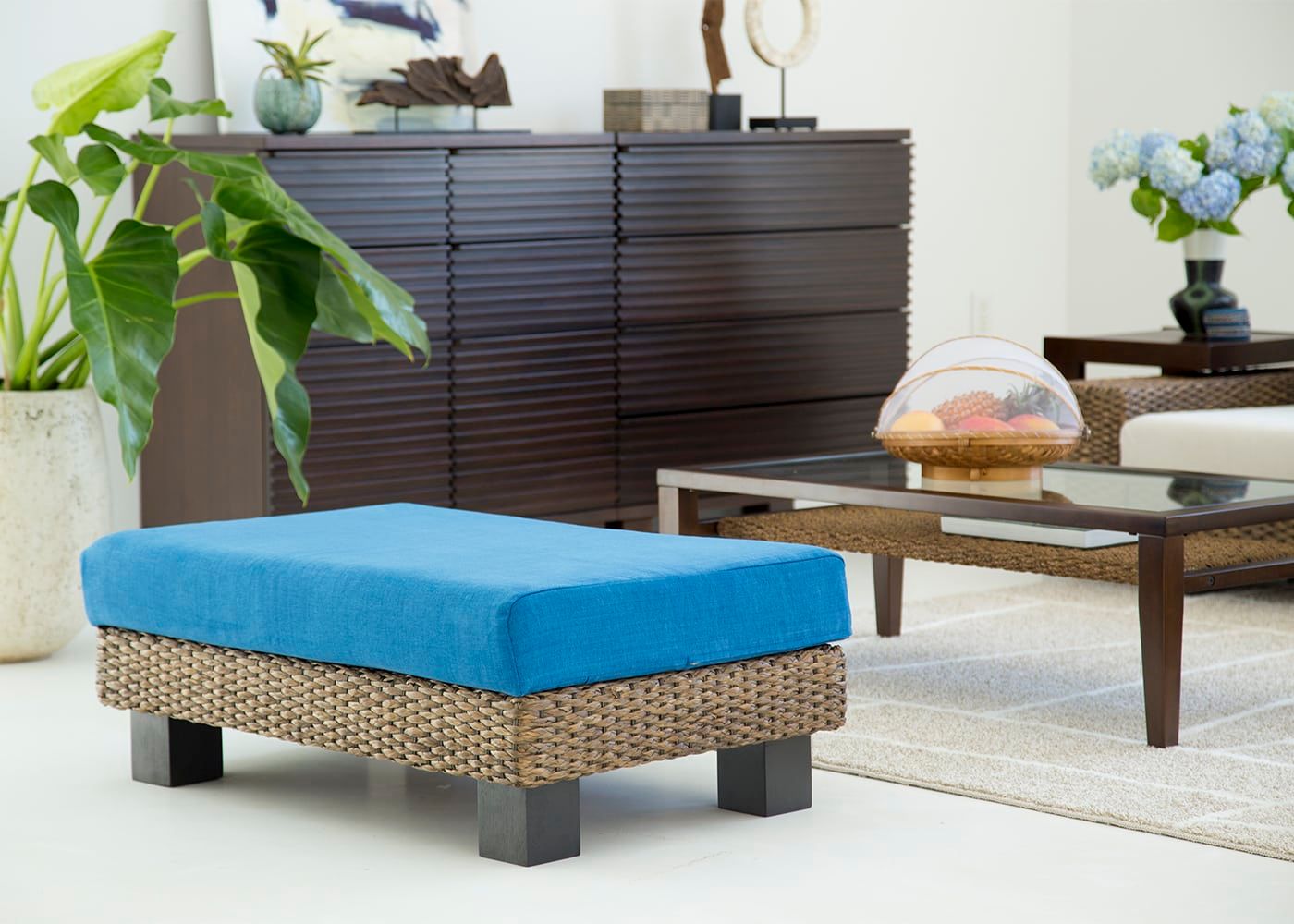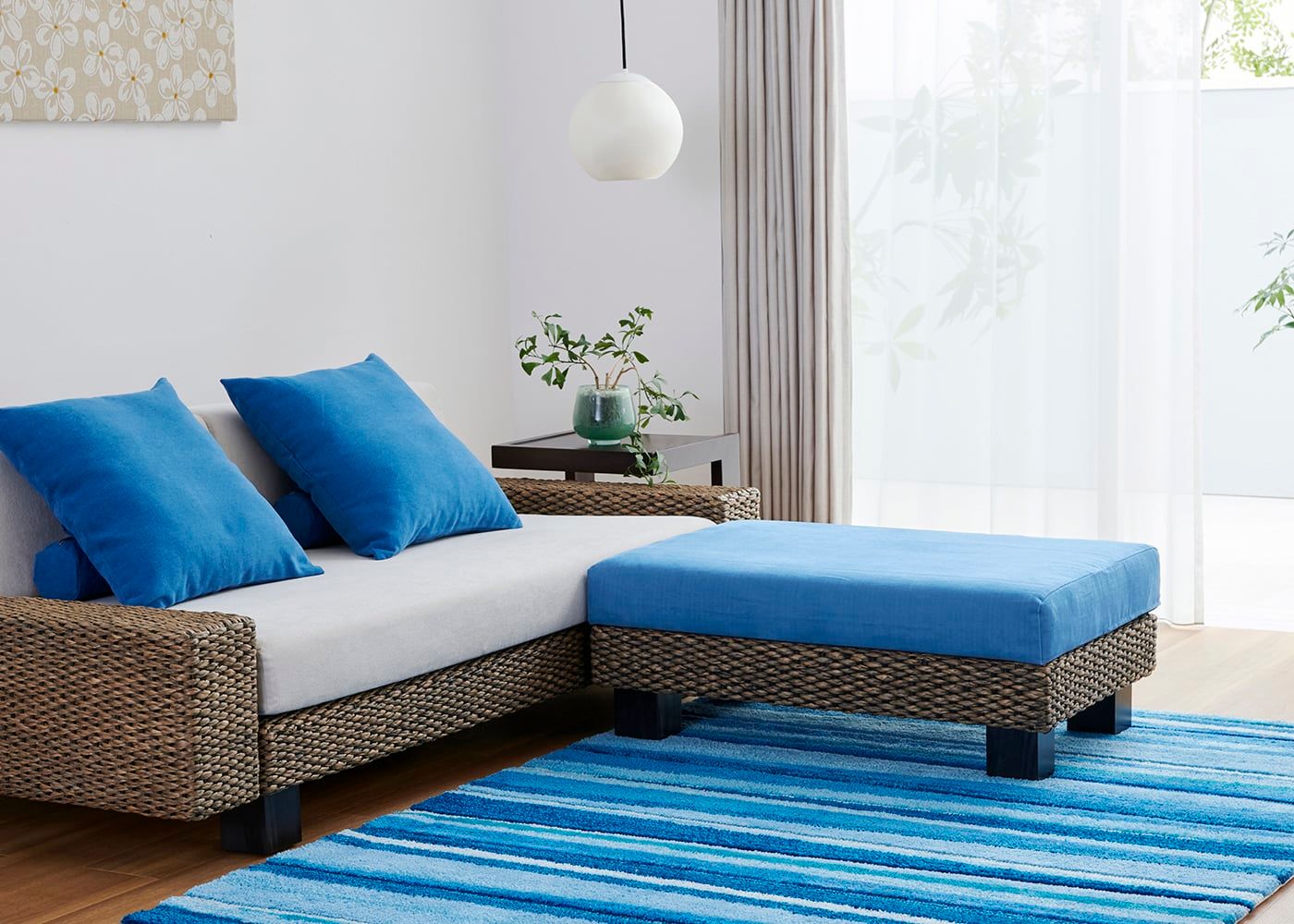 ヒヤシンスのローソファやオットマンを主役に、涼し気なブルーのカラーコーディネートで海を感じるリゾート空間を演出。開放感のあるローソファと爽快なブルーが調和し、非日常的な雰囲気を楽しめます。