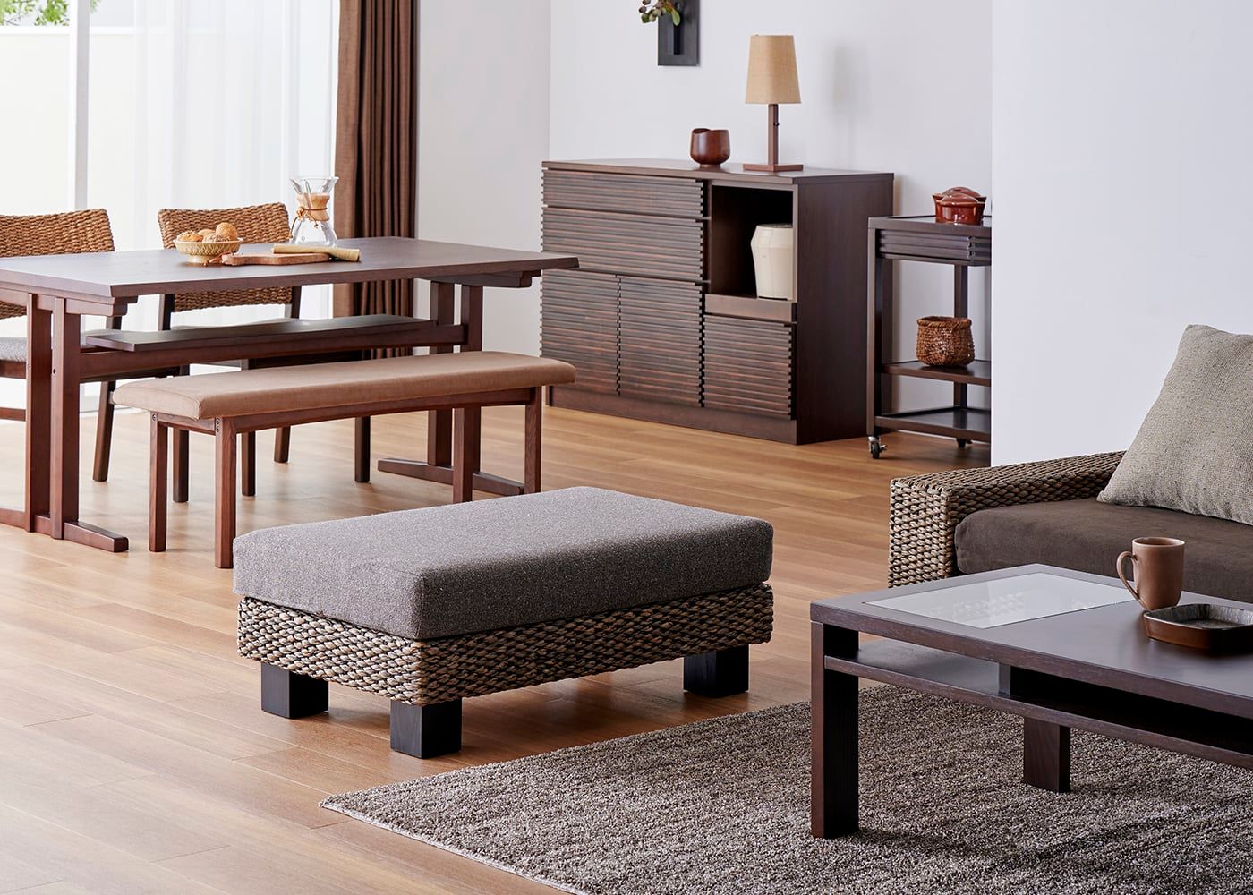 リビングダイニングで家族やゲストと過ごす際、ソファ横に置いてスツールとして使えます。広い座面が腰をしっかり支え、脚乗せにも最適なオットマンがあれば暮らしがより充実するでしょう。(写真のオットマンカバーは