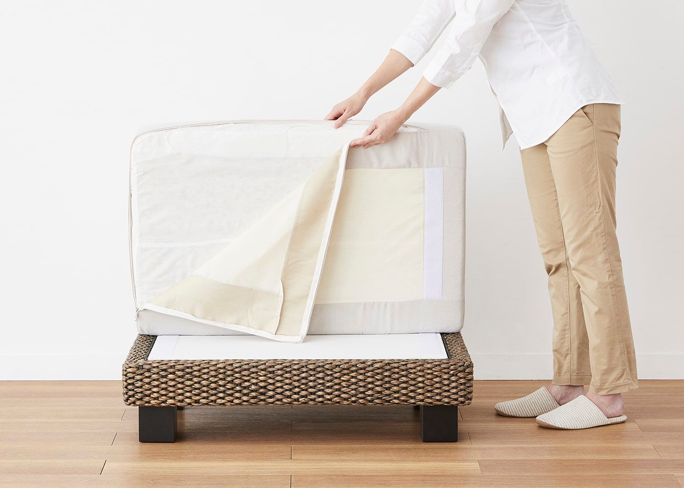 付属カバーは、わずかに起毛した上品で柔らかな風合いのポリエステル100%のファブリックです。シワになり難く摩擦に強いのも特長で、表面に撥水加工もついた機能性に優れたカバーです。