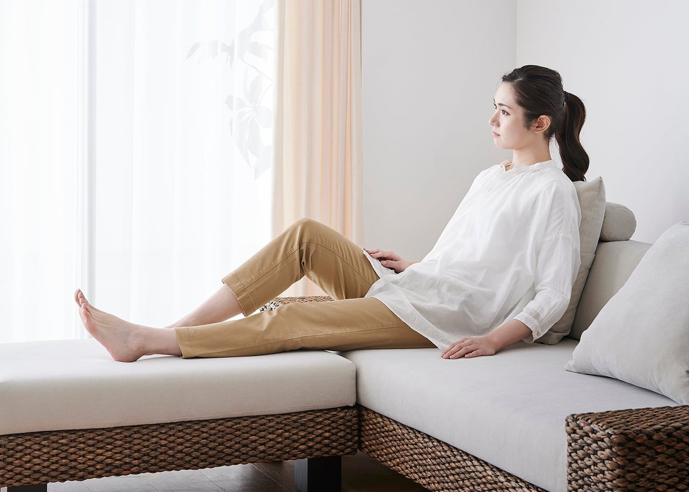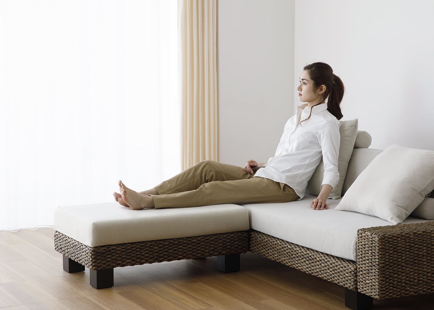 ソファの前に置いて脚を伸ばすことでリラックスでき、座面が腰から足先までしっかり支えます。これにより、負荷が一点に集中せず、体圧を均等に分散して快適に過ごすことが可能です。(写真は