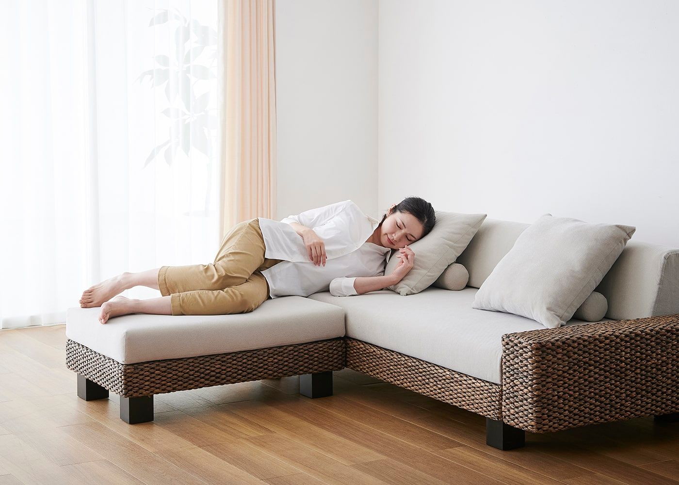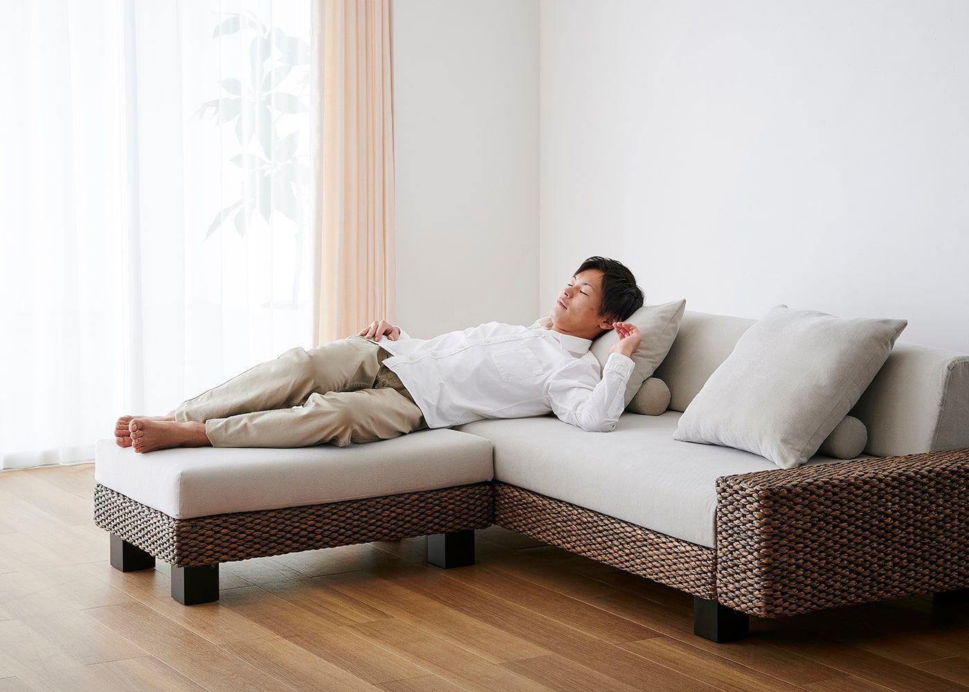 ソファ前にオットマンを置いて、背もたれのクッションを枕にすれば横になることもできます。(写真は