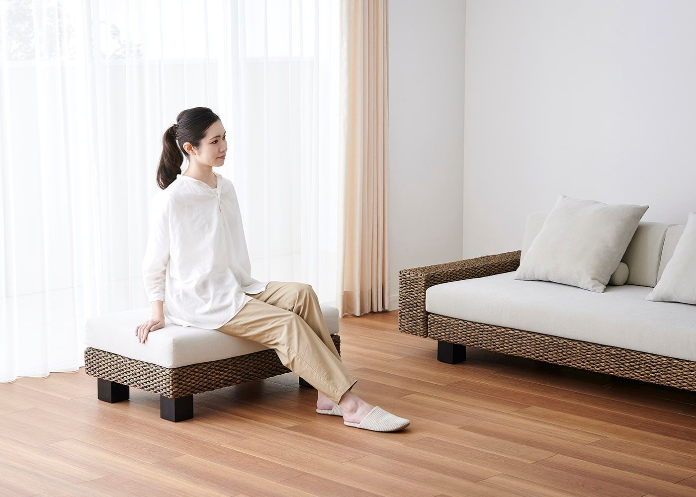 オットマンv01は、ソファ前に置くだけで脚を伸ばせる広々サイズ。全体を支えることで体圧分散性が向上し、血流が改善されてむくみにくくなります。体格を問わずリラックスしやすいワイドデザインです。(写真のソファは