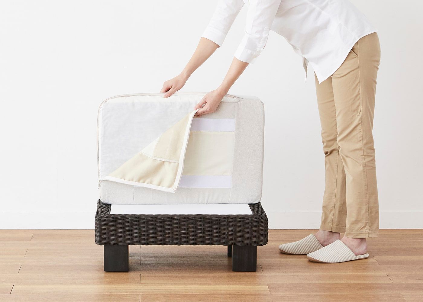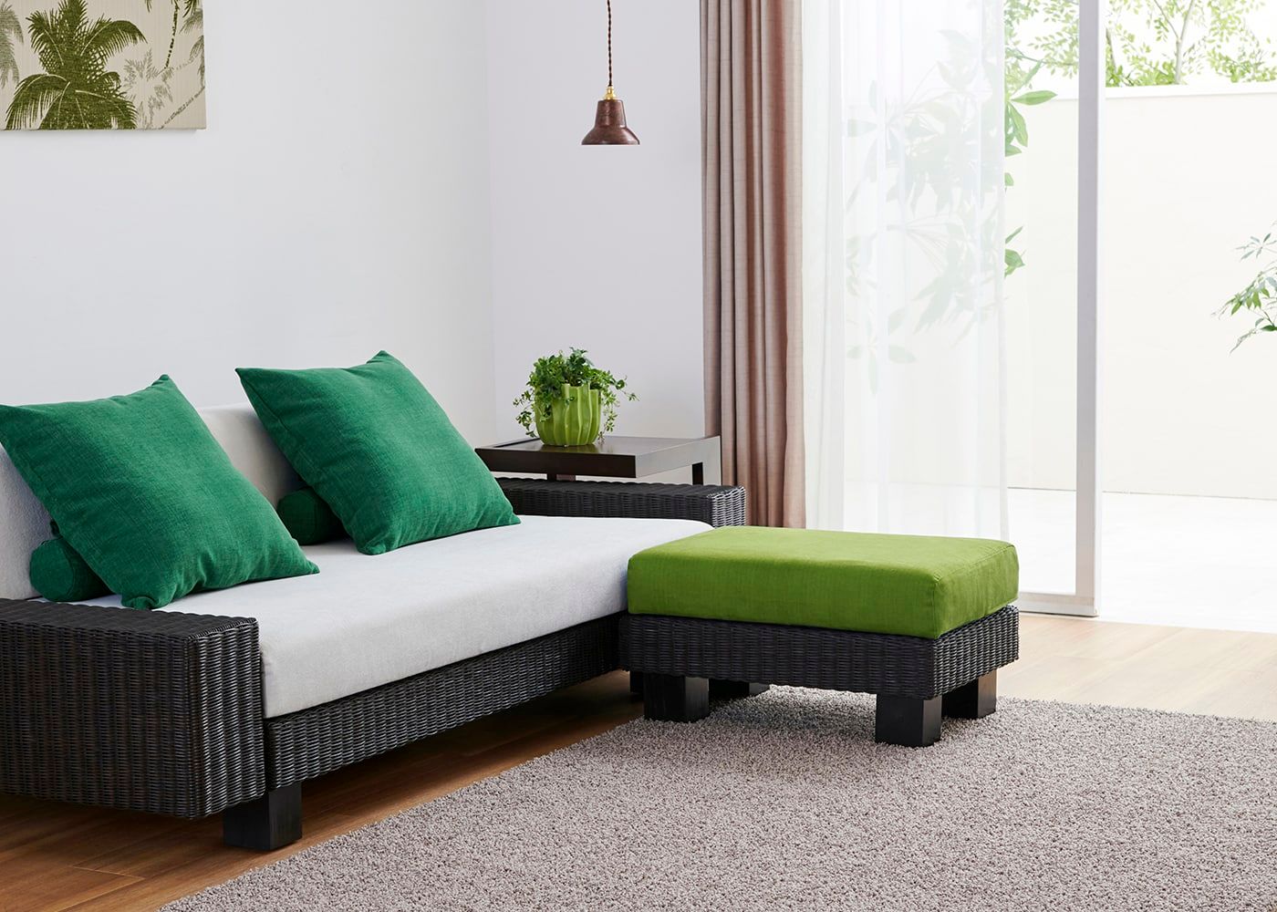 ご利用になられる方の身長や体格に合わせて、オットマンの置く向きを変えてください。また、専用の替えカバーをプラスすれば、ソファ周りにアクセントを付けることもできます。(写真のオットマンカバーは