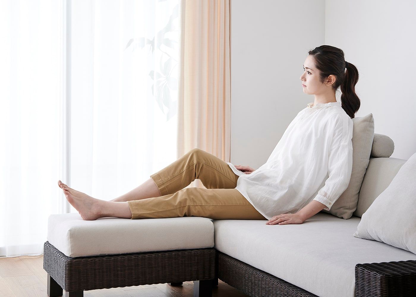 ソファ前に置くだけで、ゆったり脚を伸ばすことができるのがオットマンの魅力です。脚から腰、背中まで全体で支えてくれるため体圧分散性がアップして、血流も良くなり脚がむくみにくくなるメリットがあります。