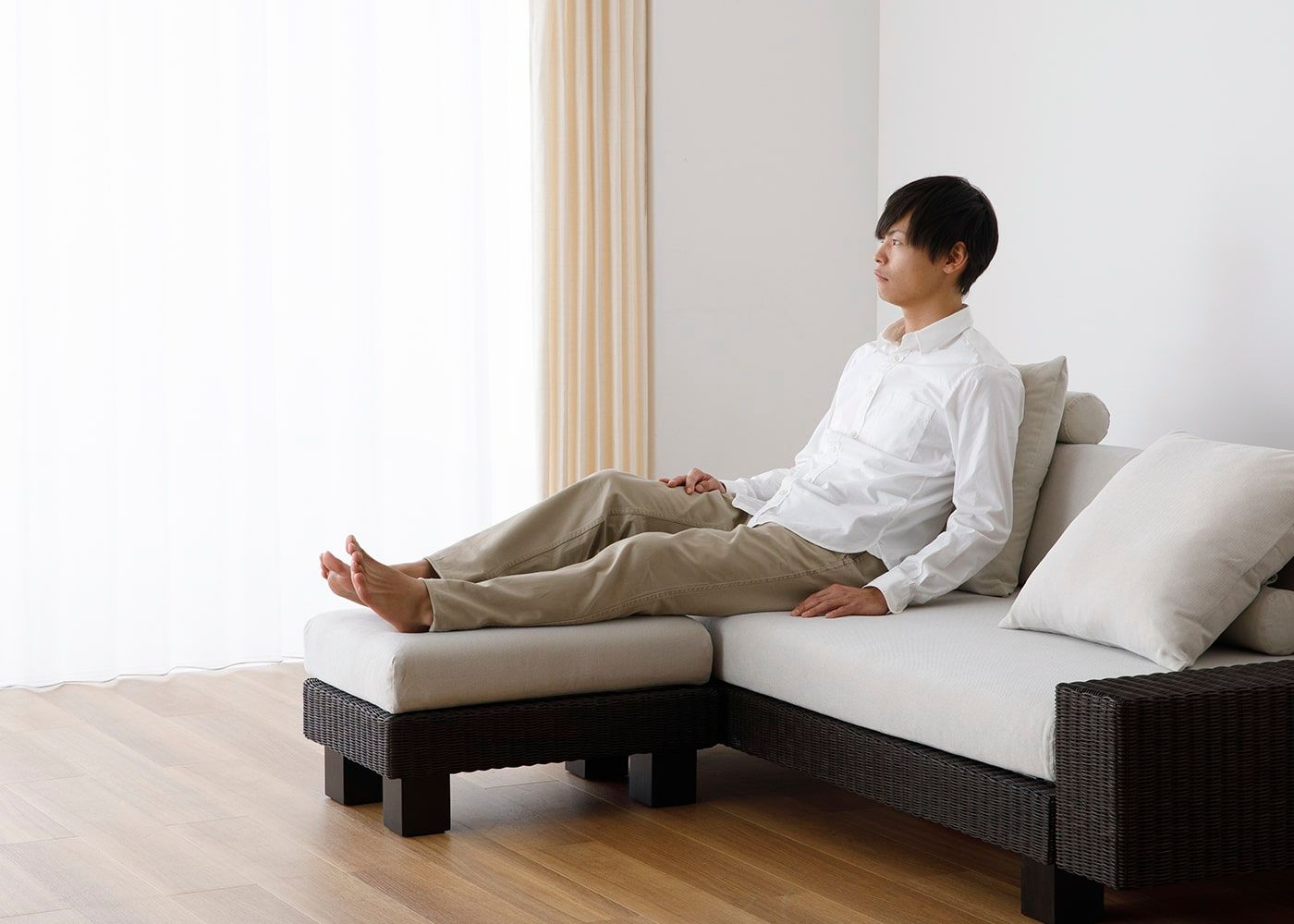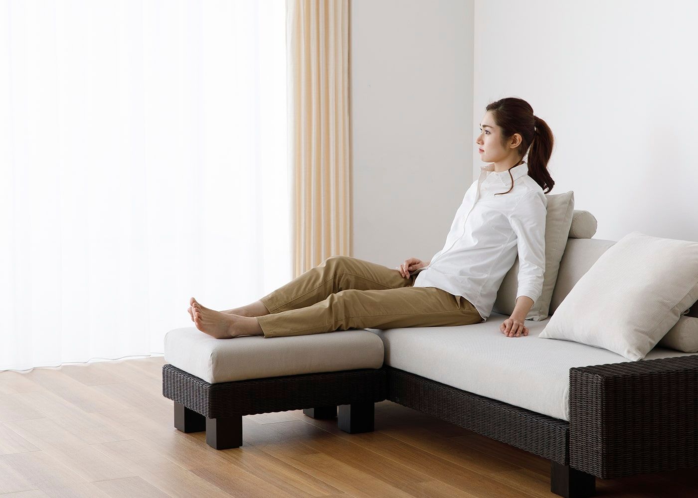 足先を上げることで血流が良くなり、脚のむくみを軽減します。長時間座っても疲れにくいのがオットマンの大きなメリット。さらに、よりゆったりと寛ぎたい時は面積の広い
