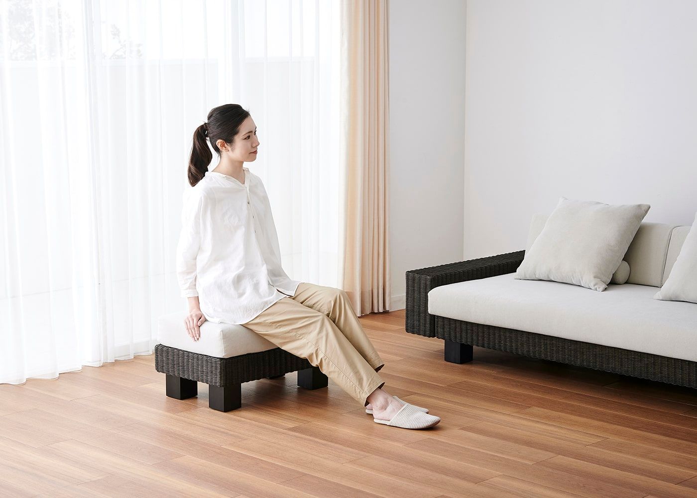 ソファの前に置いて脚を伸ばすことでリラックスでき、座面が腰から足先までしっかり支えます。これにより、負荷が一点に集中せず、体圧を均等に分散して快適に過ごすことが可能です。(写真は