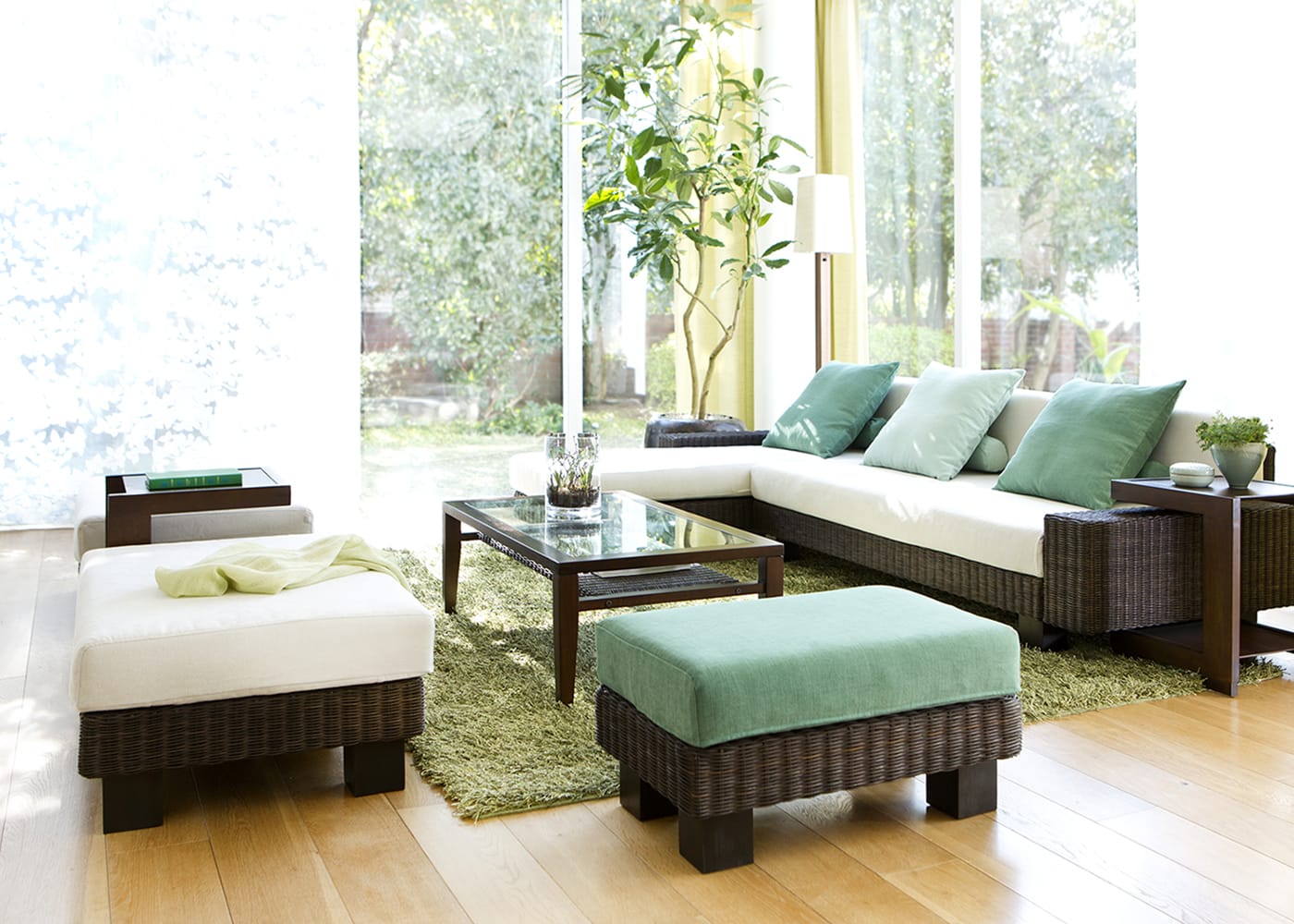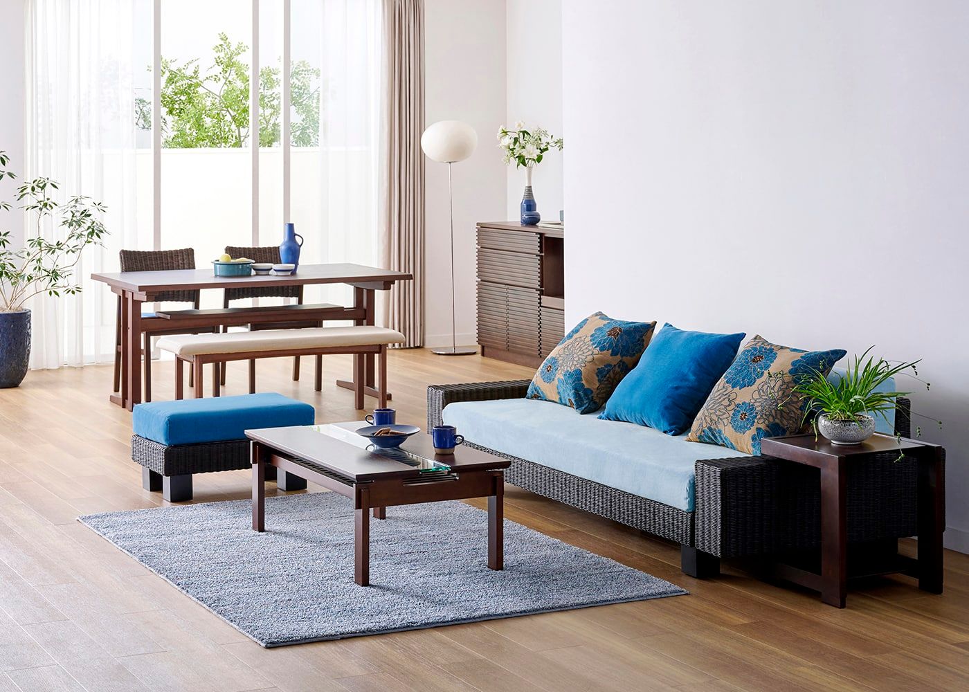 部屋を広く見せるためのフレームデザインやロー&ワイドなプロポーションにこだわりました。フレームにはアジアを代表する自然素材のラタンをしっかりと編み込んでいます。