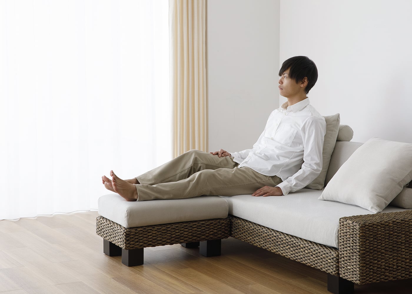 ソファの前に置いて脚を伸ばすことでリラックスでき、座面が腰から足先までしっかり支えます。これにより、負荷が一点に集中せず、体圧を均等に分散して快適に過ごすことが可能です。(写真は