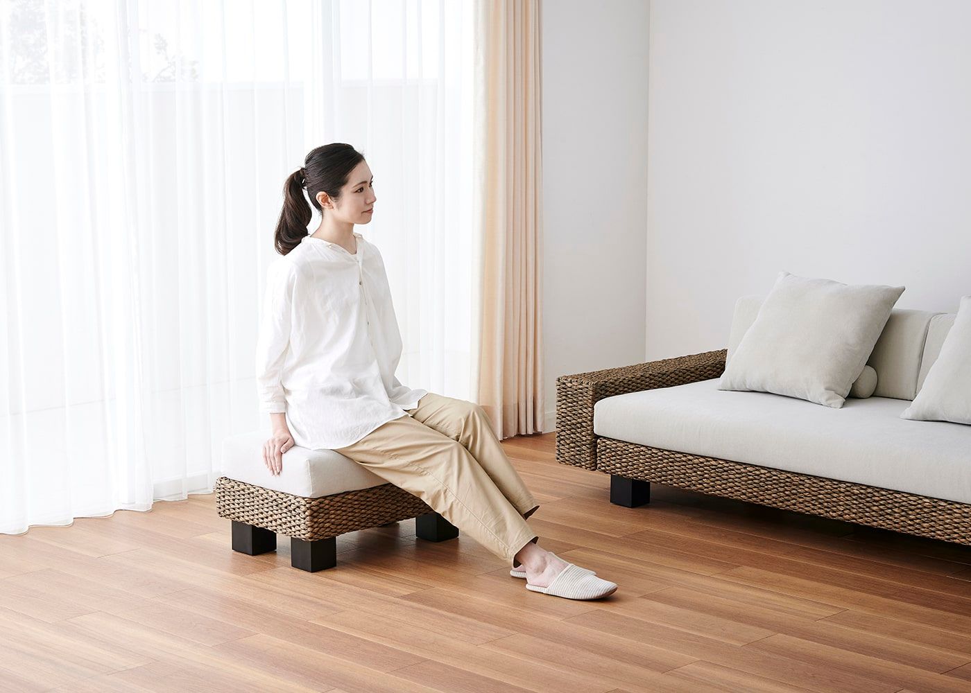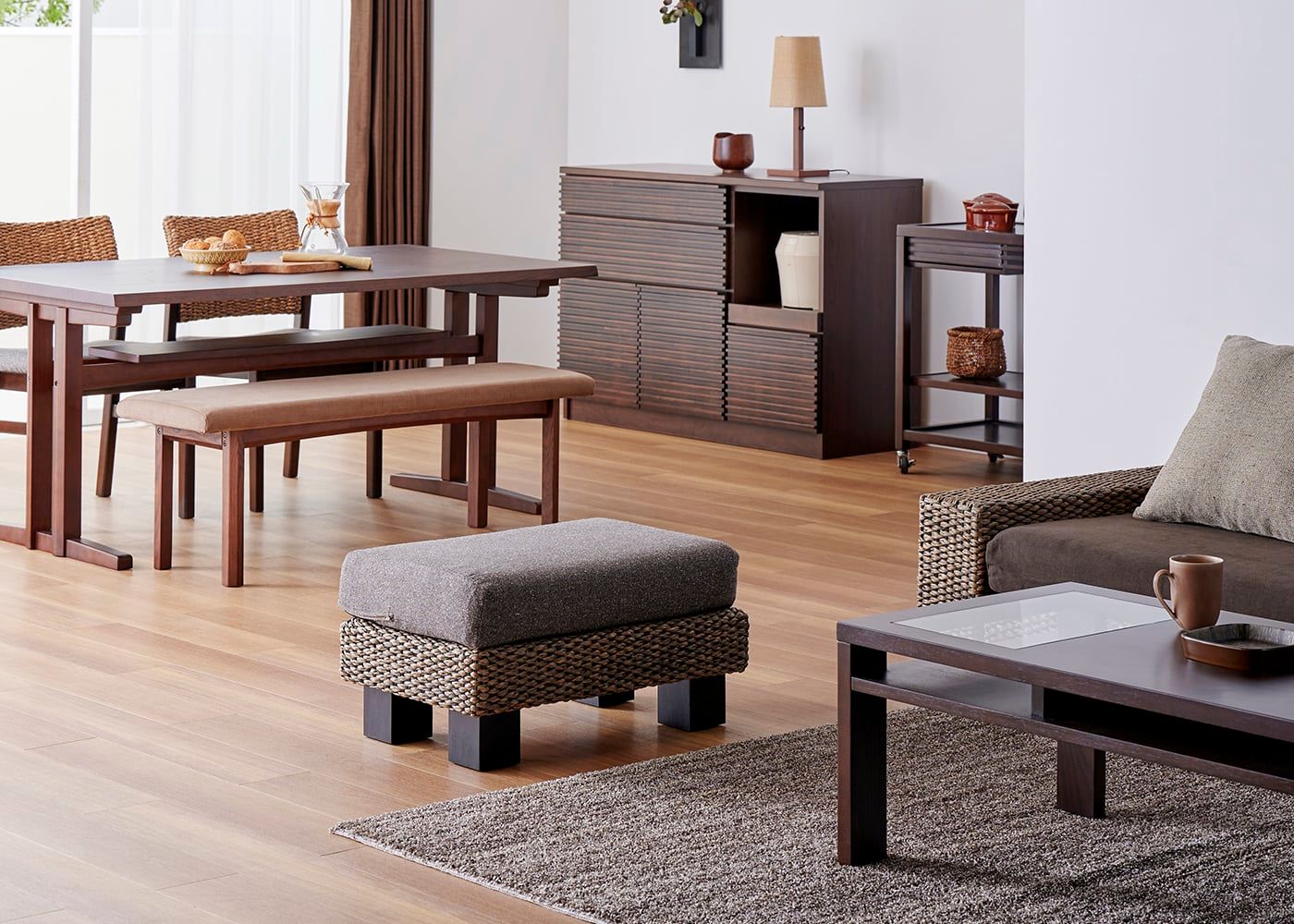 リビングダイニングで家族やゲストと過ごす際、ソファ横に置くことでスツール代わりに。弾力性のある座面が腰をしっかり支え、脚乗せとしても使えるオットマンは、暮らしをより充実させてくれます。(写真のオットマンカバーは