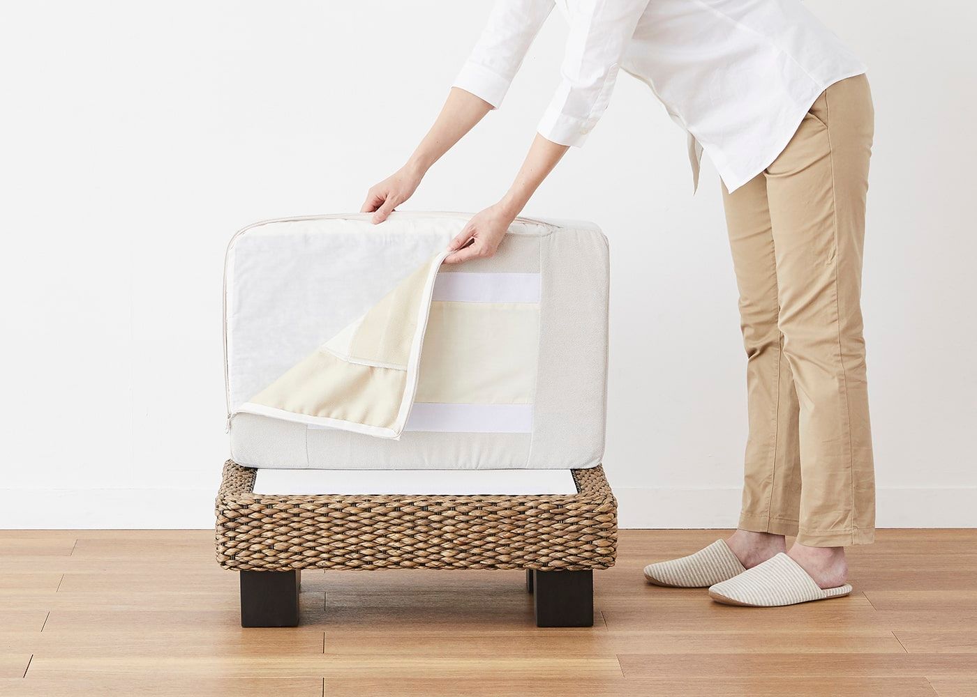 ご利用になられる方の身長や体格に合わせて、オットマンの置く向きを変えてください。また、専用の替えカバーをプラスすれば、ソファ周りにアクセントを付けることもできます。(写真のオットマンカバーは