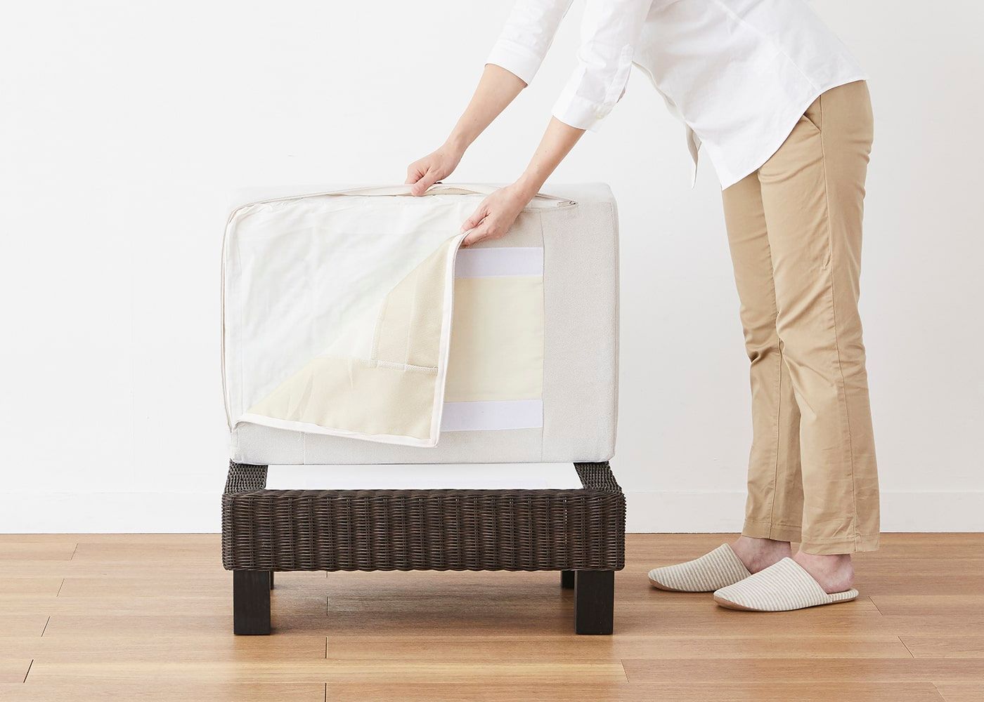 ご利用になられる方の身長や体格に合わせて、オットマンの置く向きを変えてください。また、専用の替えカバーをプラスすれば、ソファ周りにアクセントを付けることもできます。(写真のオットマンカバーは