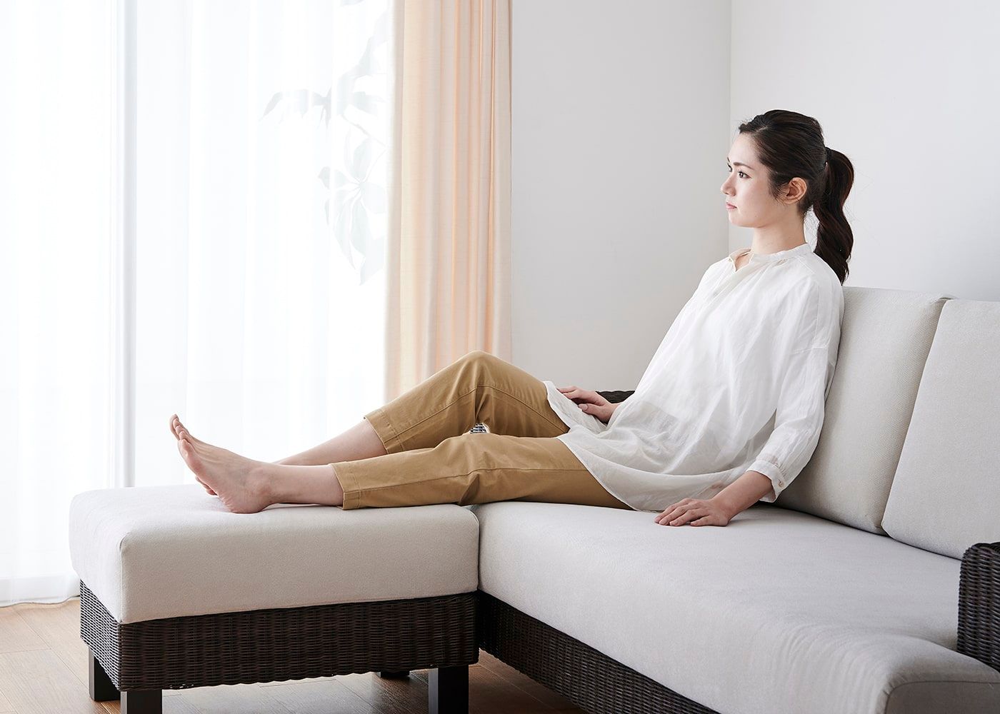 ソファの前に置いて、カウチソファのように脚を伸ばして座ることで、よりリラックスできます。しっかりした硬さの弾力性があるオットマンが、足の先から身体を優しく支えてくれるでしょう。(モデルは身長167cmの女性)