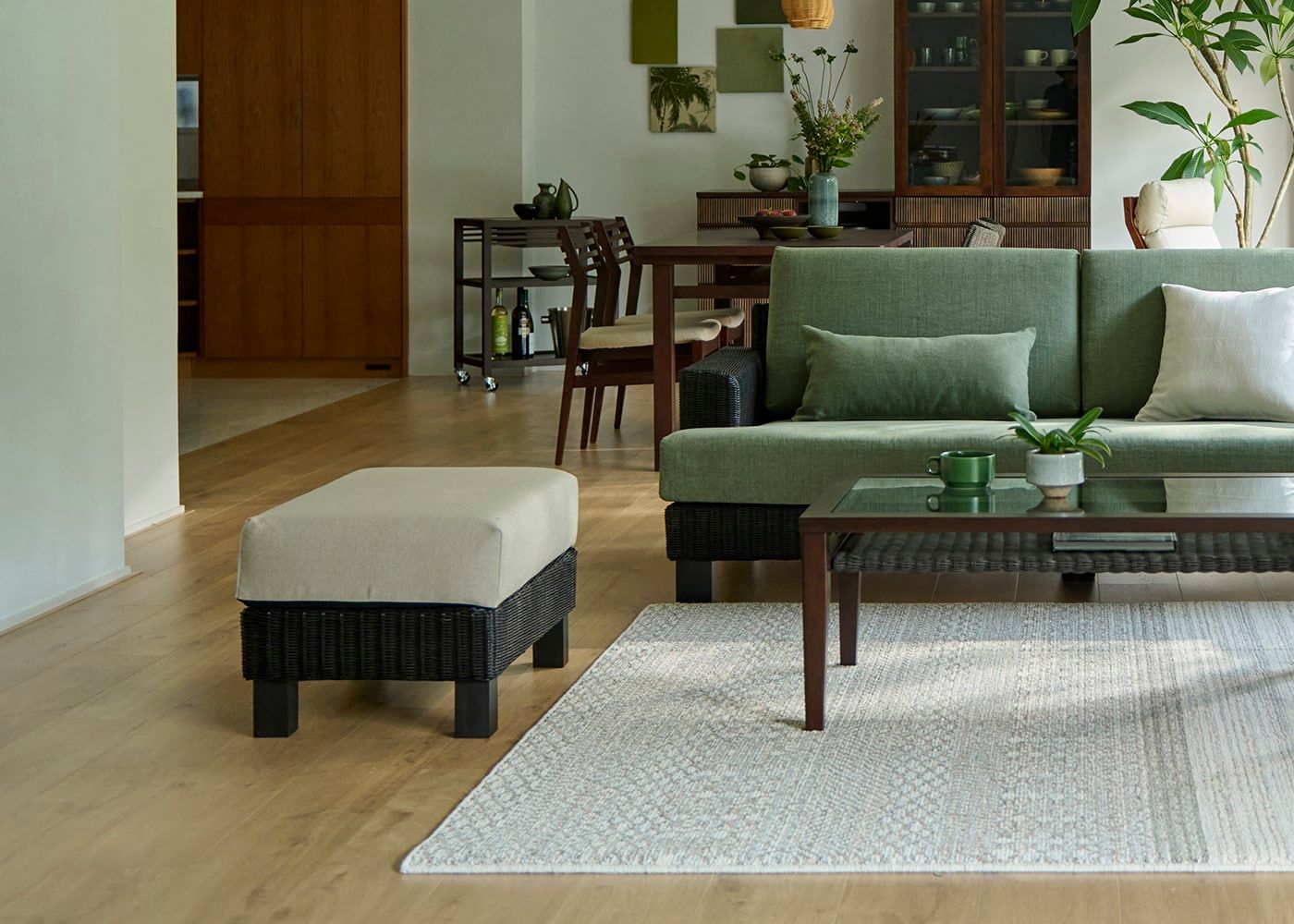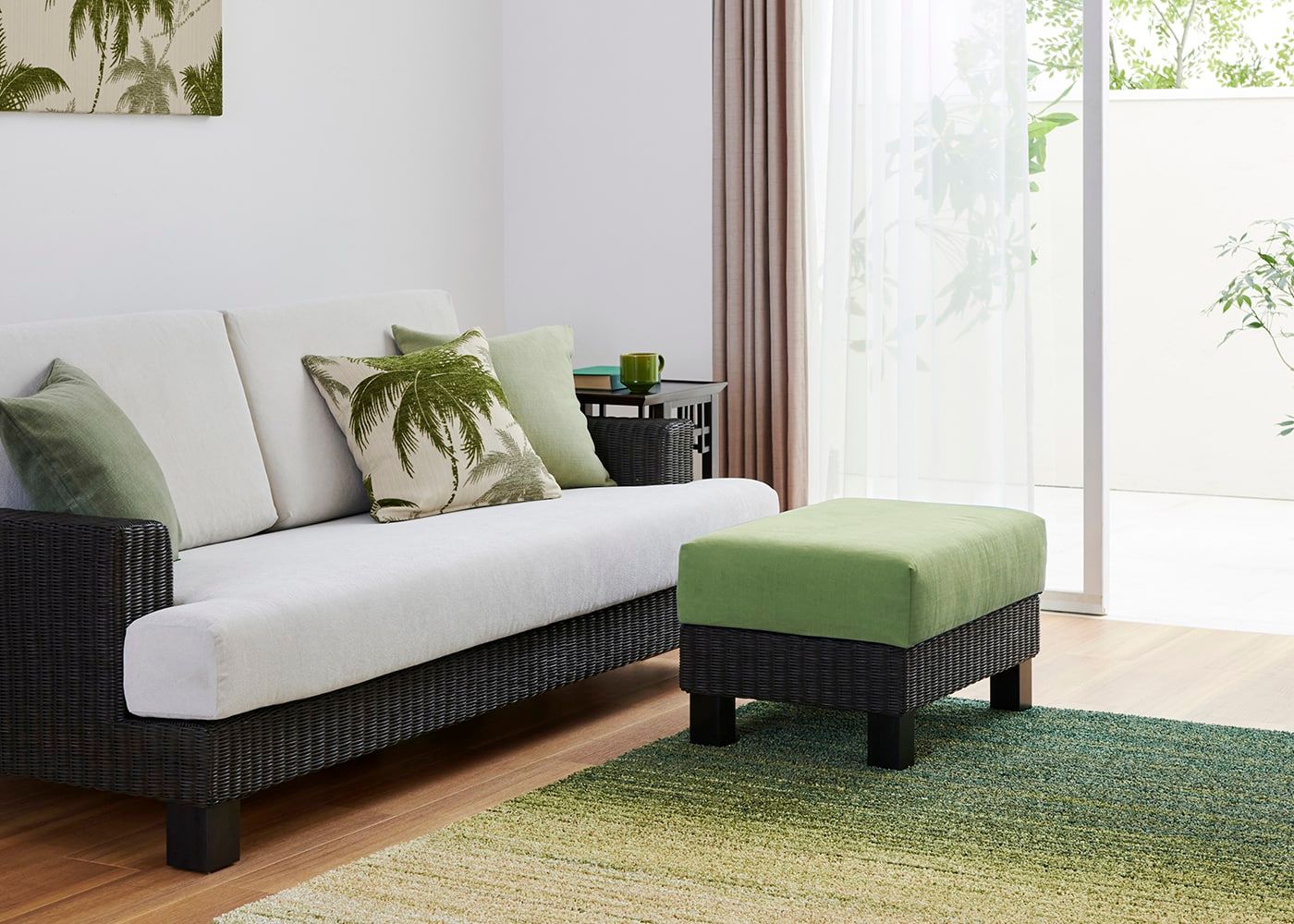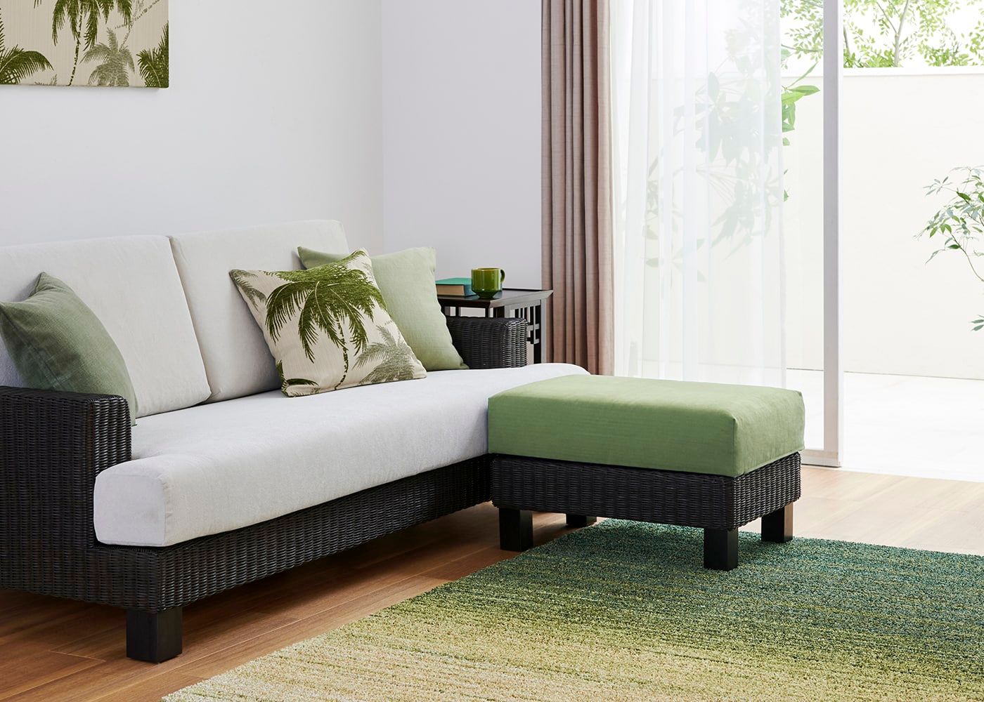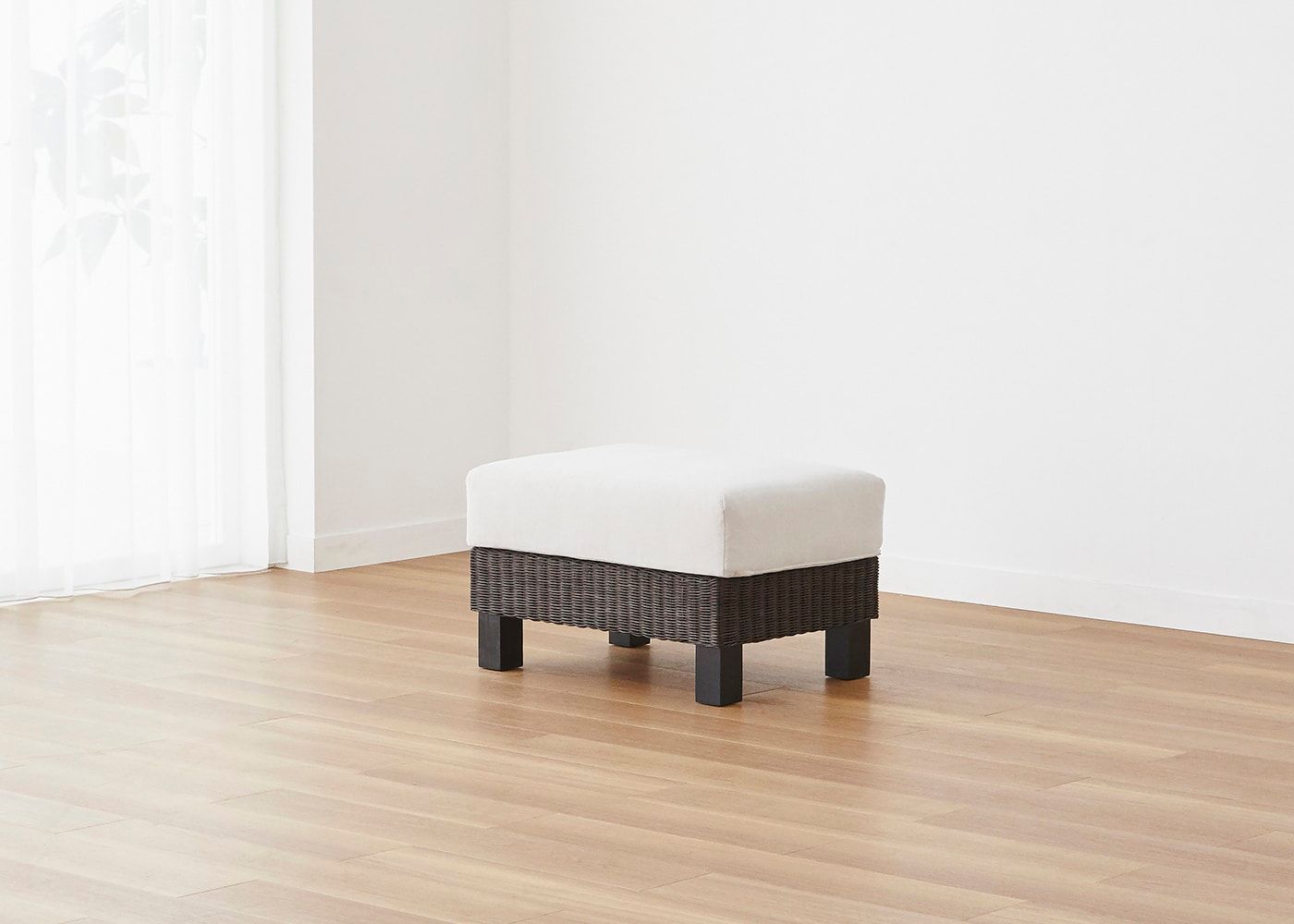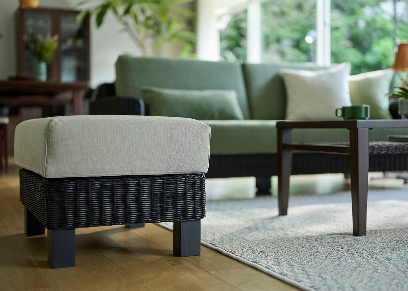 シン・ソファ (ラタン)専用のオットマンです。v02タイプはどこにでも置きやすいコンパクトサイズです。座面は程よい硬さのクッションで、脚を伸ばすとしっかりと支えてくれるため、長い時間でもリラックスしてソファライフを楽しめます。(写真は