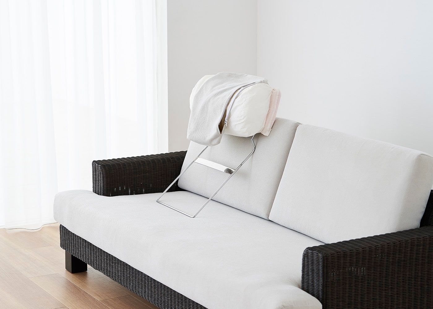 取り付け方法は背クッションの後ろに支柱のスチールフレームを差し込むだけなので、取り外しが簡単です。