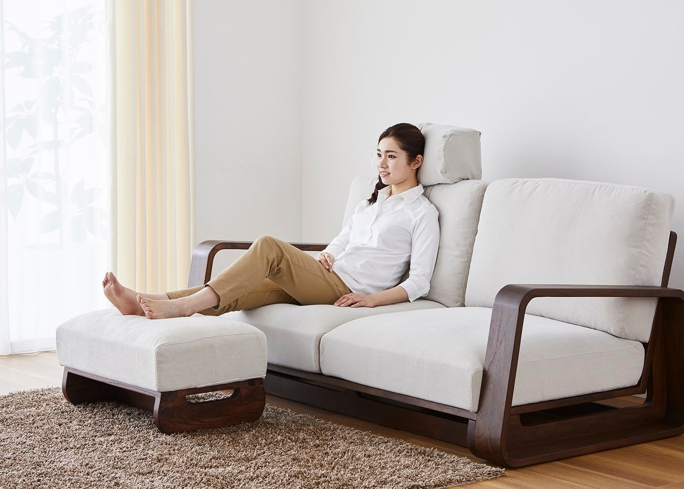 オットマンと組み合わせると、より安楽性を追求したソファセットの完成です。足先を上げていることで血流が良くなり、脚がむくみにくくなります。長時間座っていても疲れないのがオットマンを使う大きなメリットです。(モデルは身長167cmの女性)