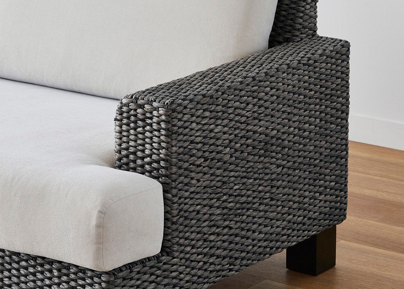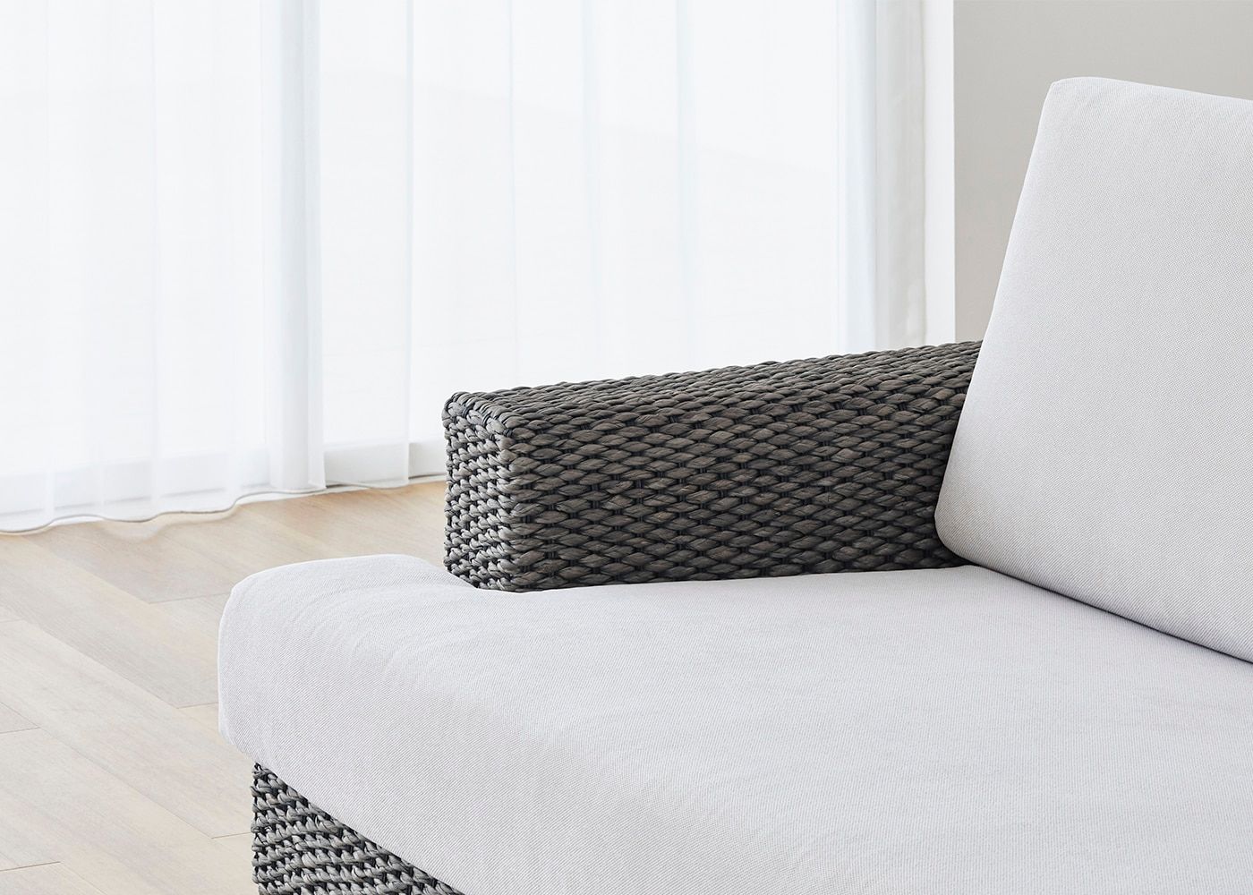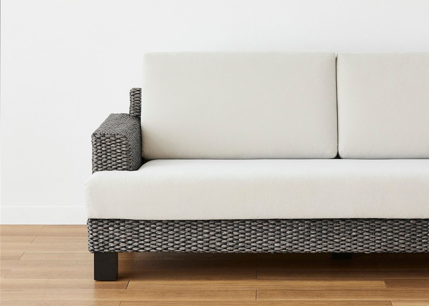 シン・ソファ (ヒヤシンスDG)の特徴でもある奥行きの浅いアーム。丁寧に編み込まれたヒヤシンス素材も軽やかに見える、抜け感が魅力のデザインです。