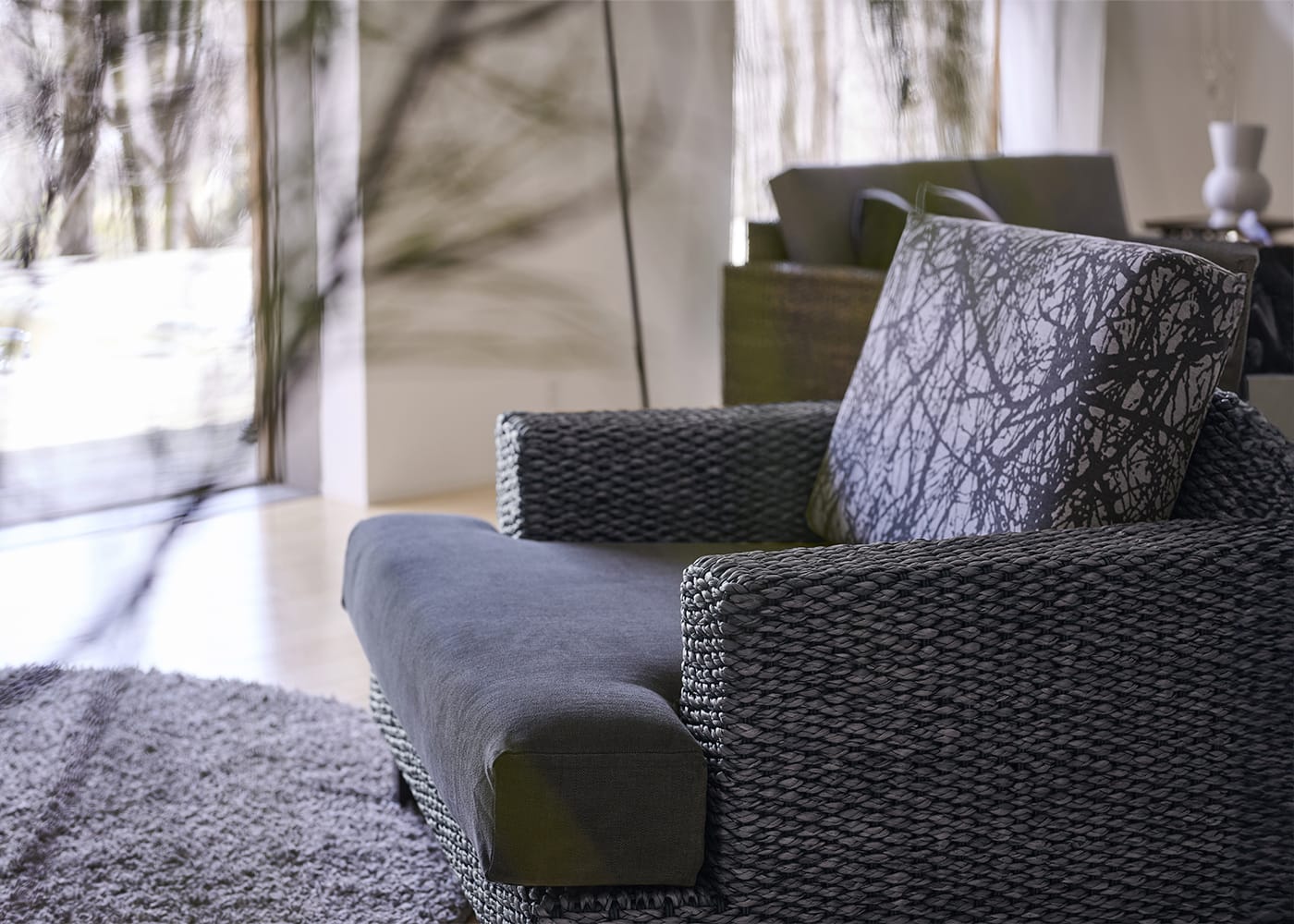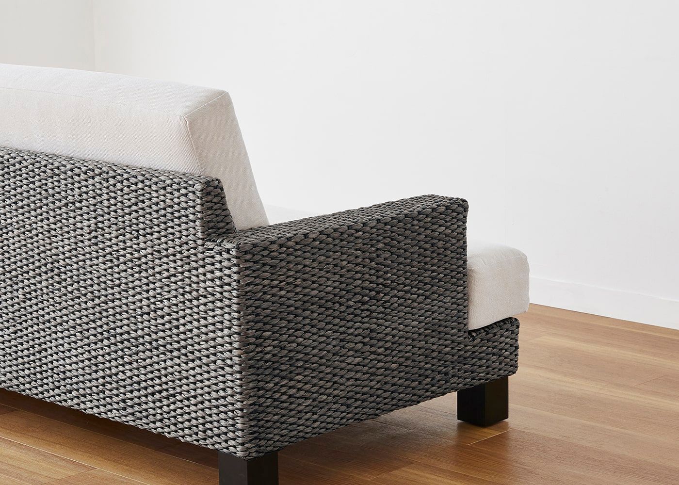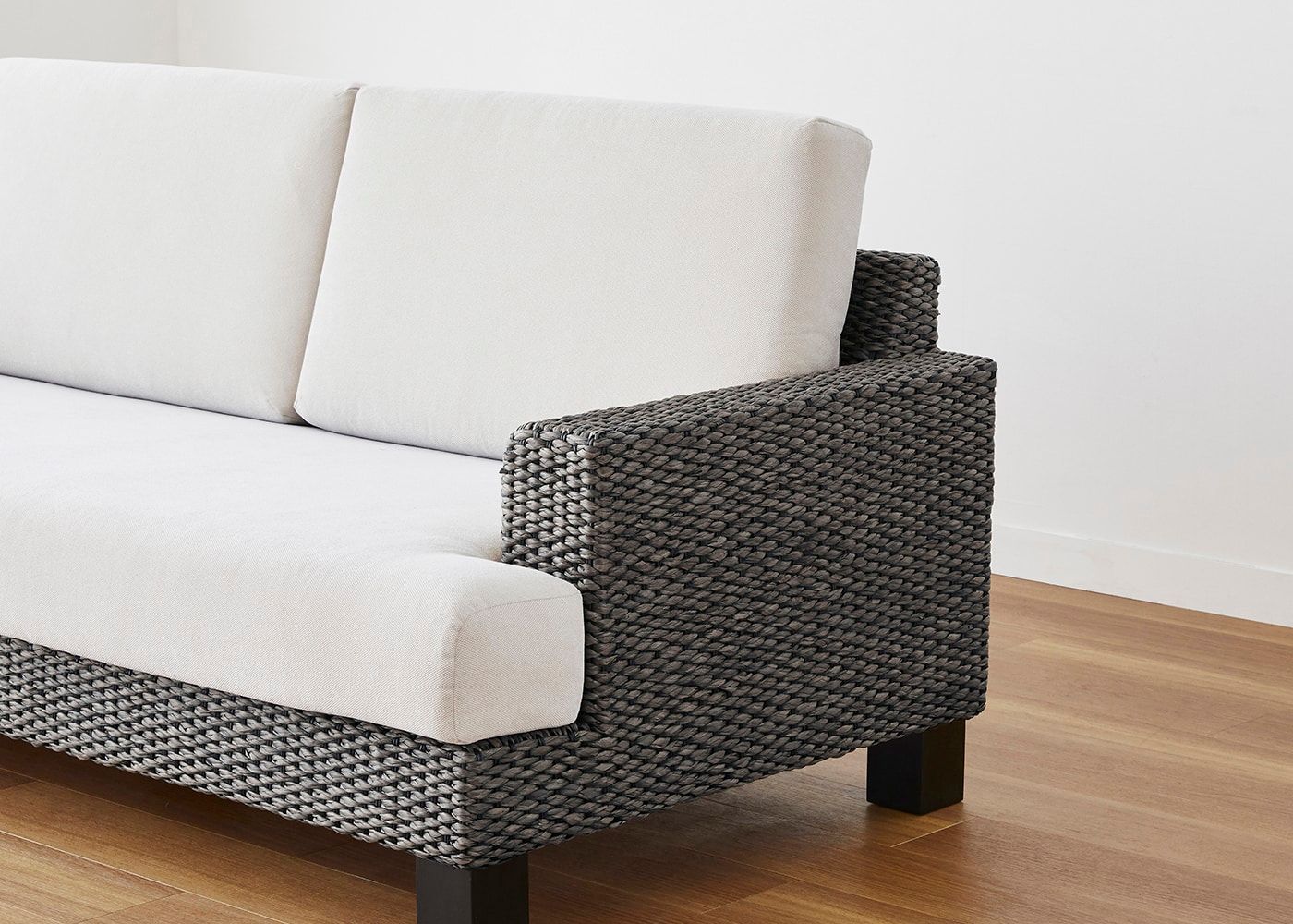 シン・ソファ (ヒヤシンスDG)の特徴でもある奥行きの浅いアーム。丁寧に編み込まれたヒヤシンス素材も軽やかに見える、抜け感が魅力のデザインです。