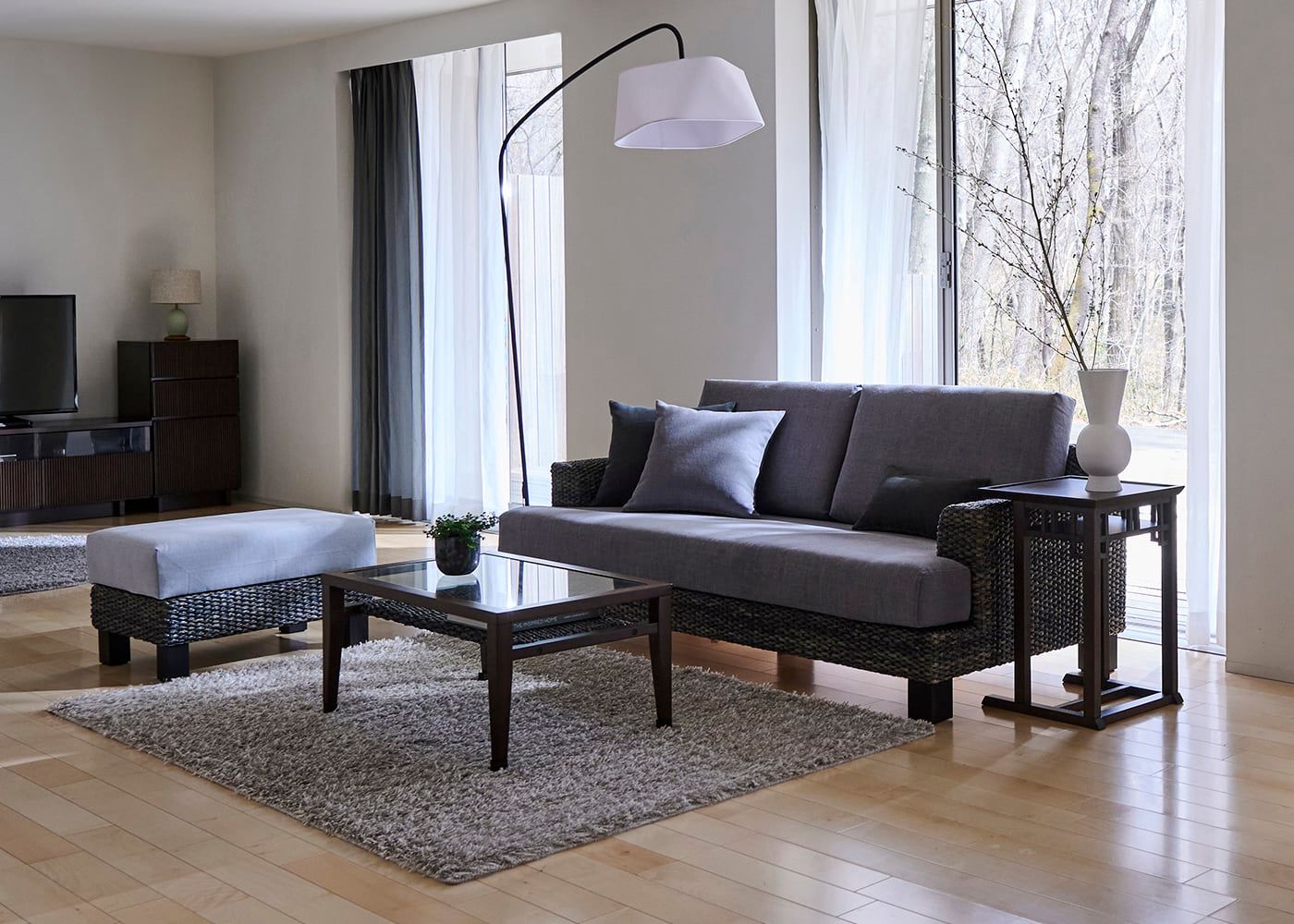 シン・ソファ(ヒヤシンスDG)を主役にダークブラウンのテーブルを組んだリビング。カバーに落ち着いたグレーを添えて、動きのあるフロアランプやグレーのラグとコーディネートしました。(写真は2.5人掛けソファと1人掛けソファの組み合わせ)