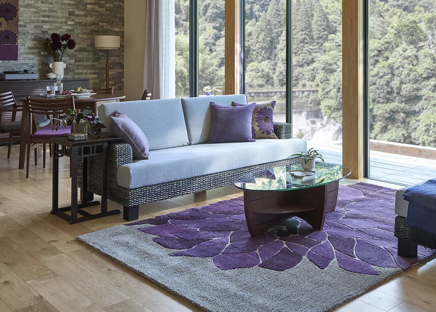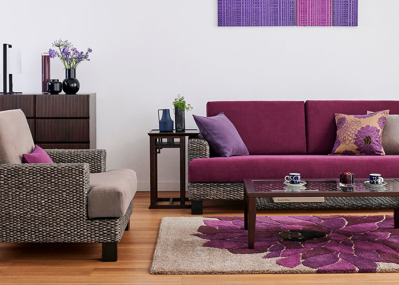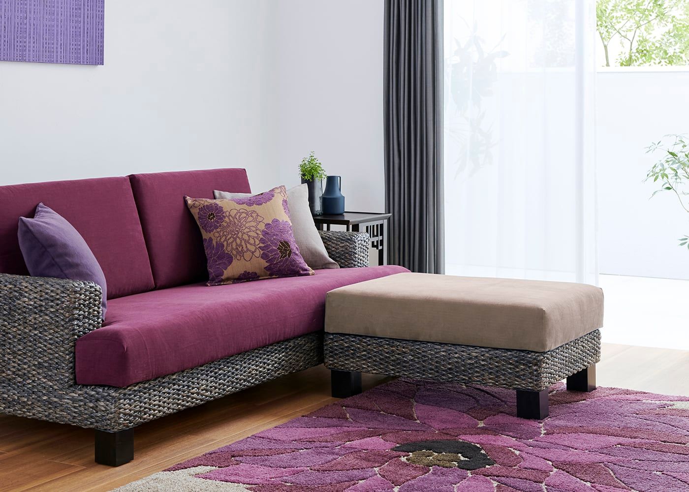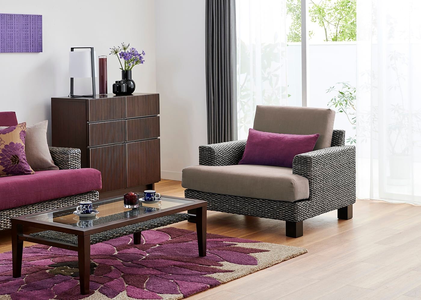 編み込みが美しいシン・ソファ (ヒヤシンスDG)は、パープル系インテリアと美しく調和します。洗練された色合いと素材の質感が、上品で優雅な雰囲気を引き立てます。≫フラワーパープル・スタイルの詳細はこちら