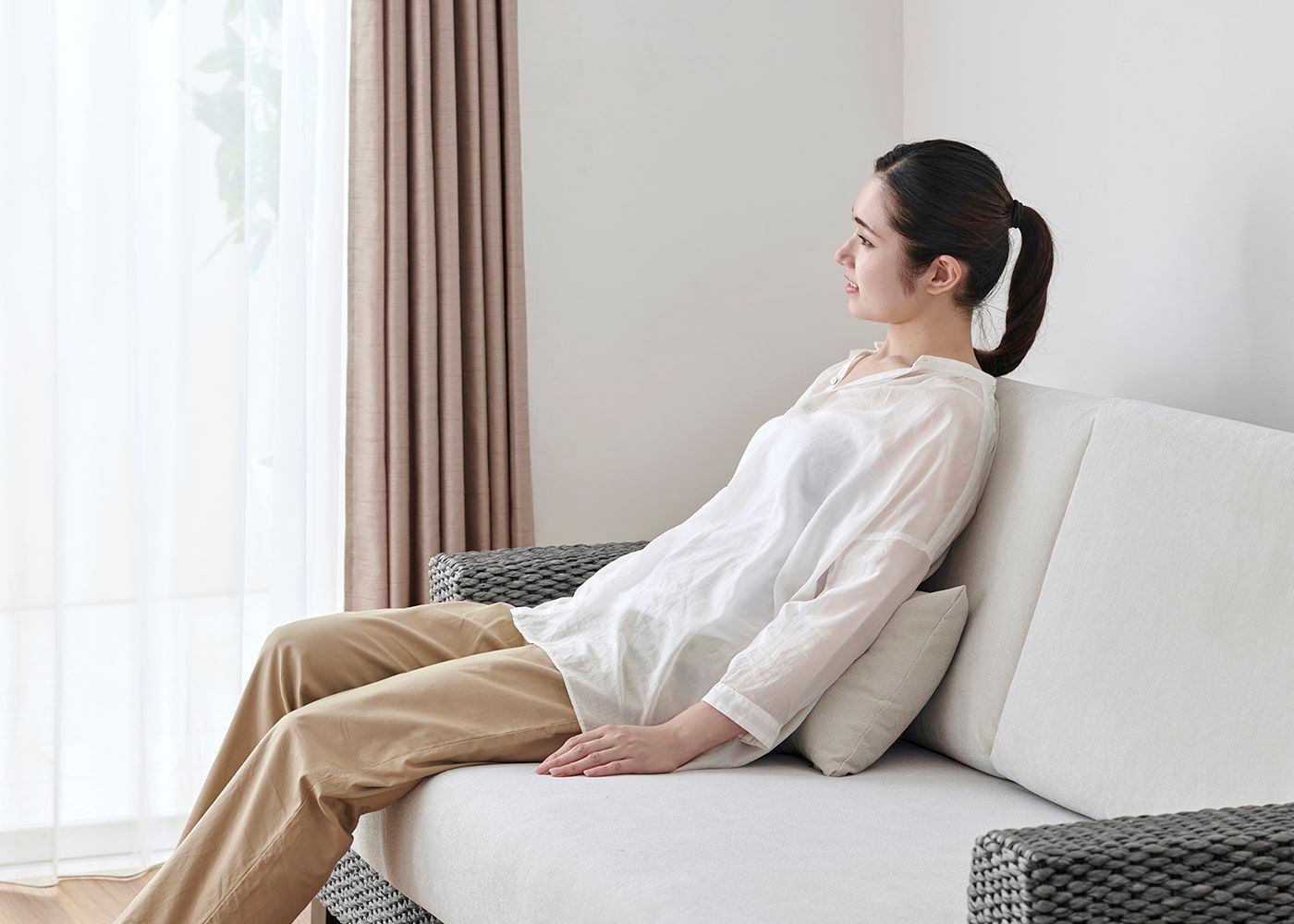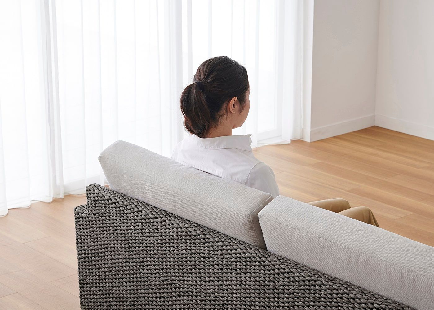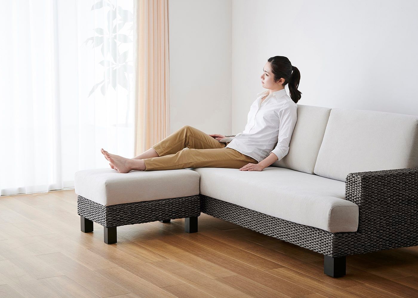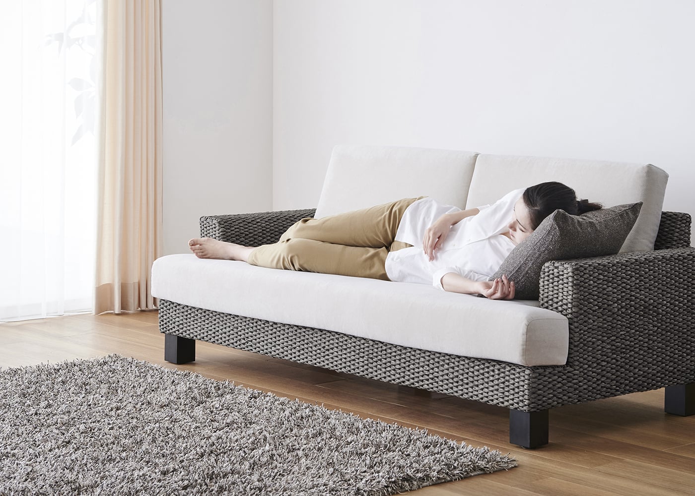 ほどよい硬さで設計された背と座面のクッションが身体をしっかりと支えてくれます。リゾートの寛ぎを感じるようなソファで毎日をゆったりと過ごしてみては?(モデルは身長167cmの女性)≫【特集】快適性を追求したバランスの良い座り心地