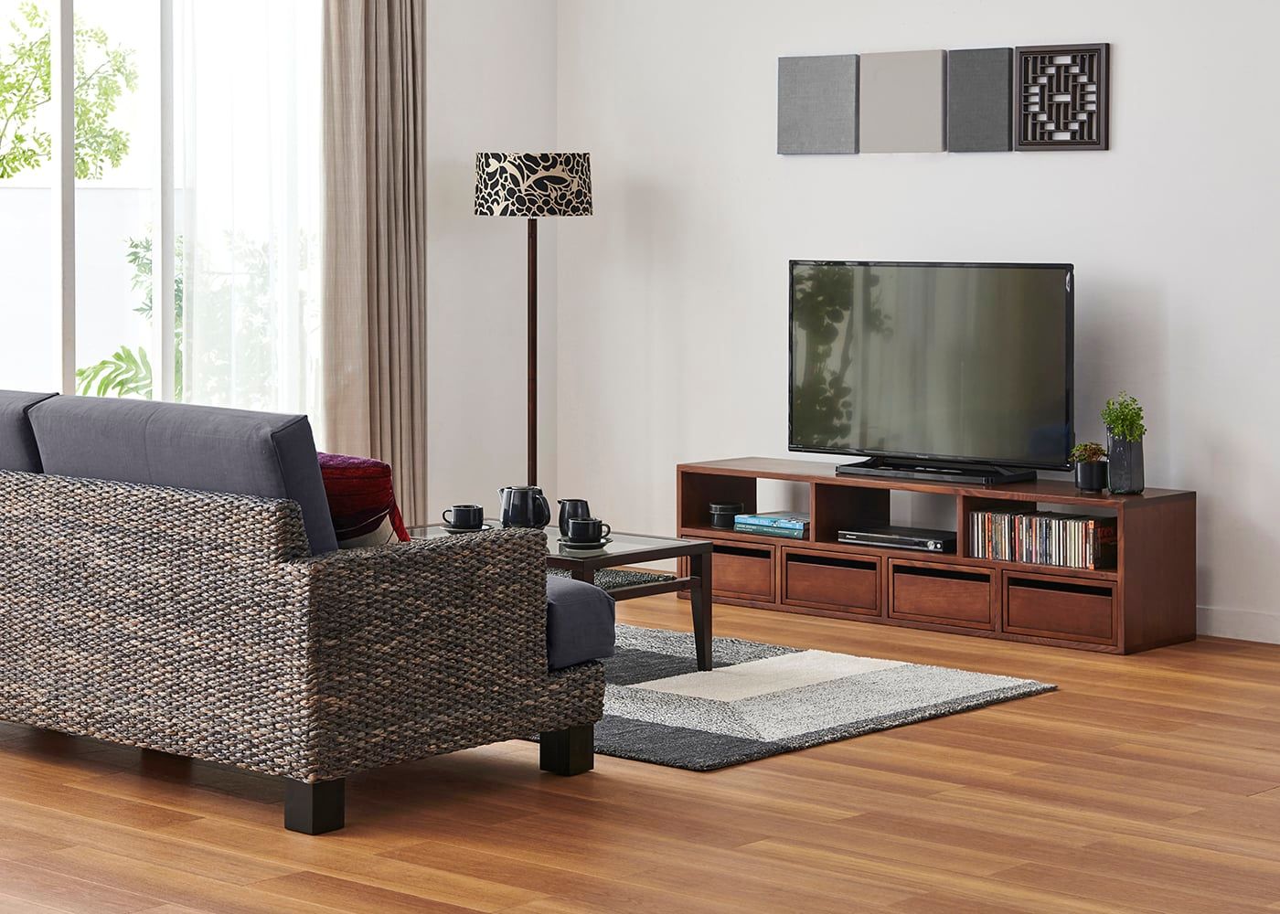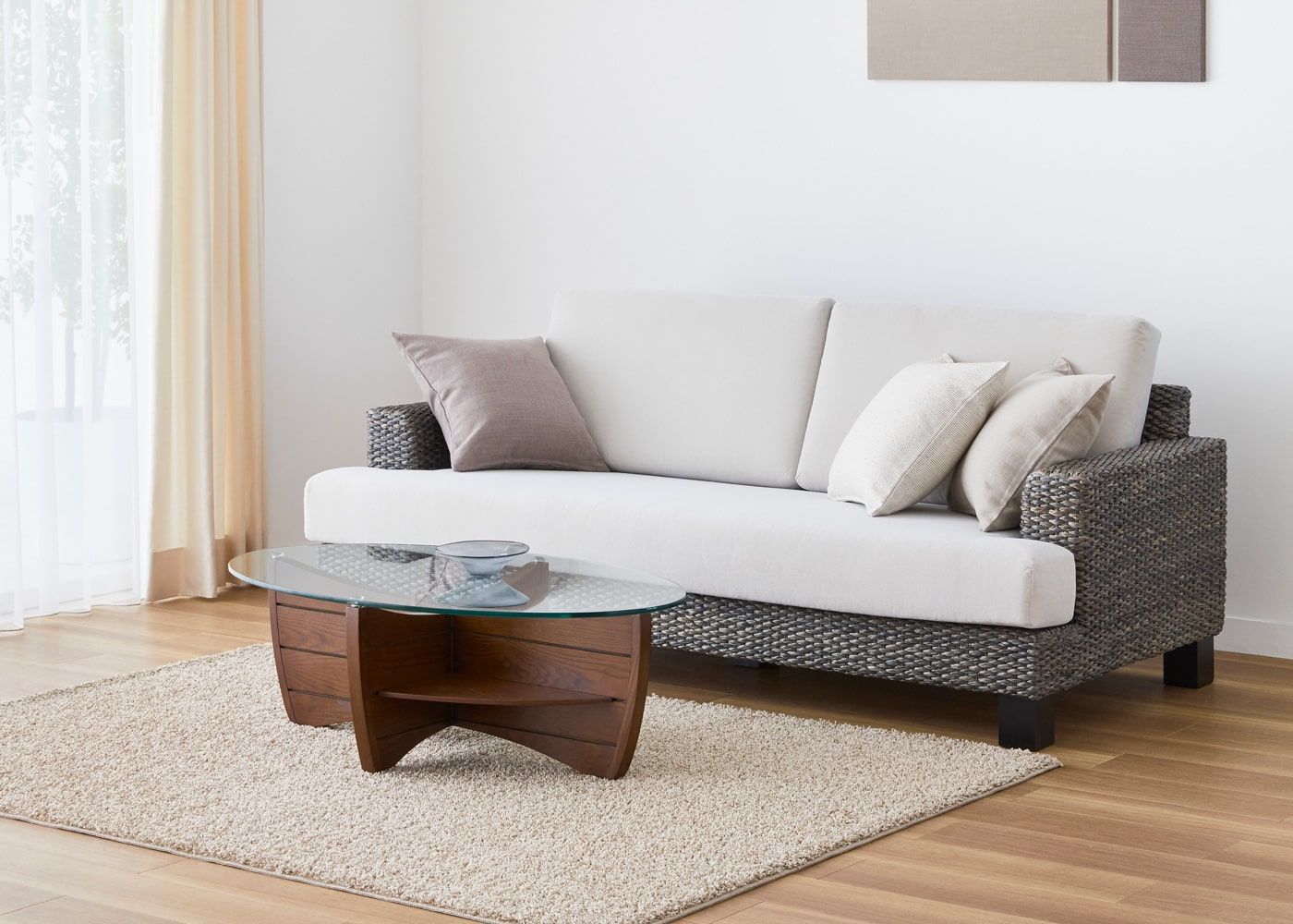 職人が丁寧に編み込んだ天然素材のフレームと、シンプルながらもこだわりの詰まったデザインが魅力のシン・ソファ (ヒヤシンスDG)。同じ素材のローテーブルと組み合わせることで、統一感のある空間としてコーディネートできます。≫シン・ソファ×ローテーブルの組み合わせ例を一覧で見る