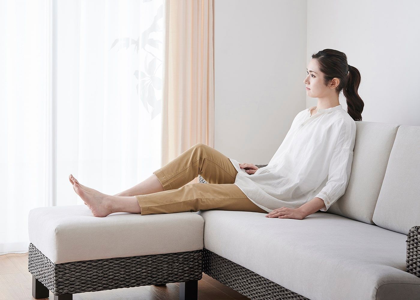 ソファ前に置くだけで、ゆったり脚を伸ばすことができるのがオットマンの魅力です。脚から腰、背中まで全体で支えてくれるため体圧分散性がアップして、血流も良くなり脚がむくみにくくなるメリットがあります。(モデルは身長167cmの女性)