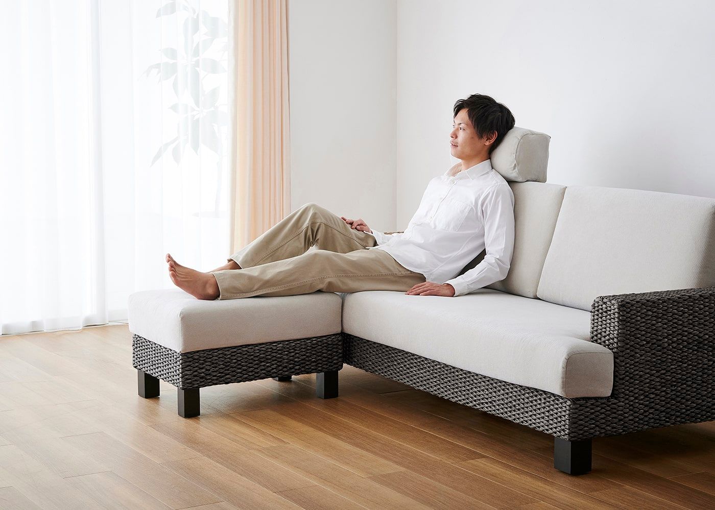 ヘッドレストとオットマンをプラスすれば、頭から足の先まで身体全体を支えてくれる、極上の座り心地を得られます。よりリラックスした姿勢でソファでの生活を楽しんでみては?