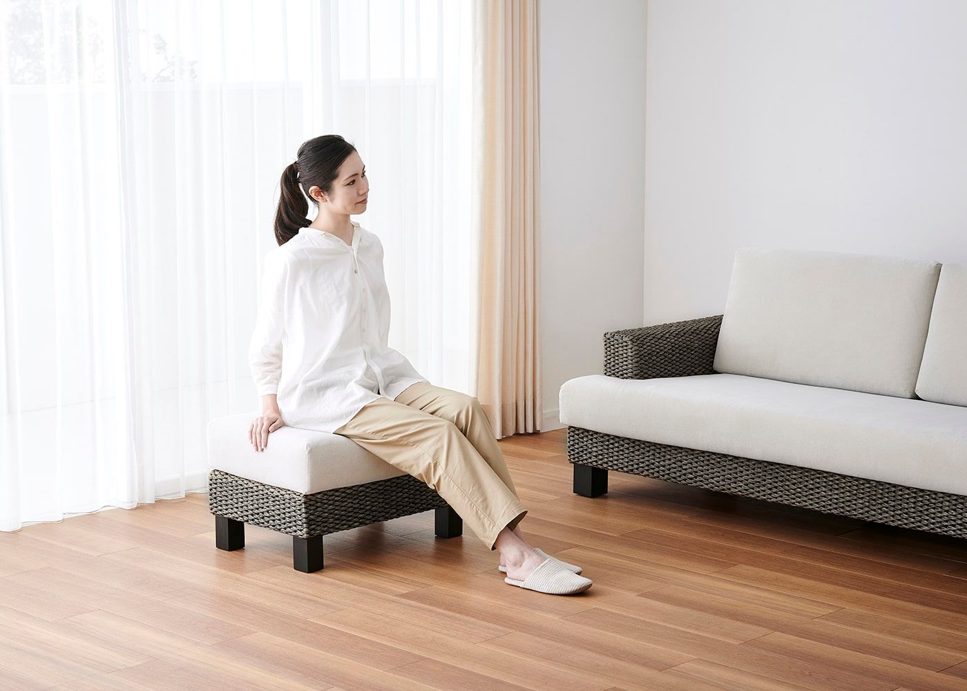 ソファの前に置いて、カウチソファのように脚を伸ばして座ることで、よりリラックスできます。しっかりした硬さの弾力性があるオットマンが、足の先から身体を優しく支えてくれるでしょう。(モデルは身長167cmの女性)