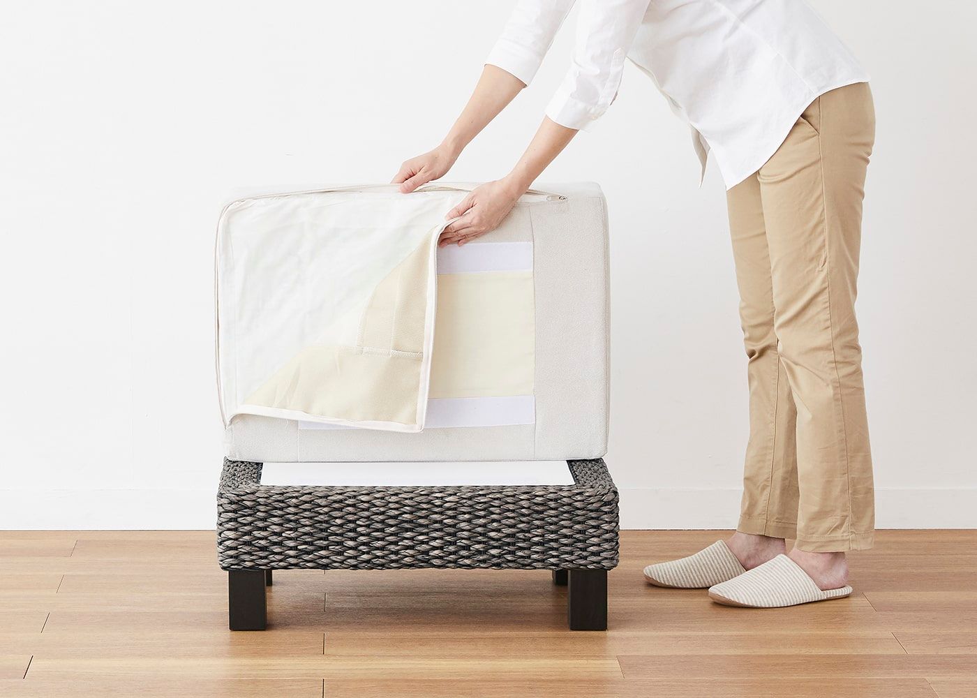 ご利用になられる方の身長や体格に合わせて、オットマンの置く向きを変えてください。また、専用の替えカバーをプラスすれば、ソファ周りにアクセントを付けることもできます。(写真のオットマンカバーは