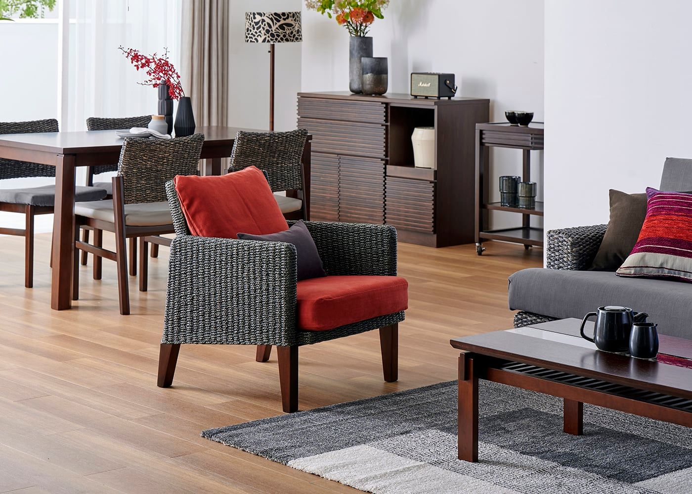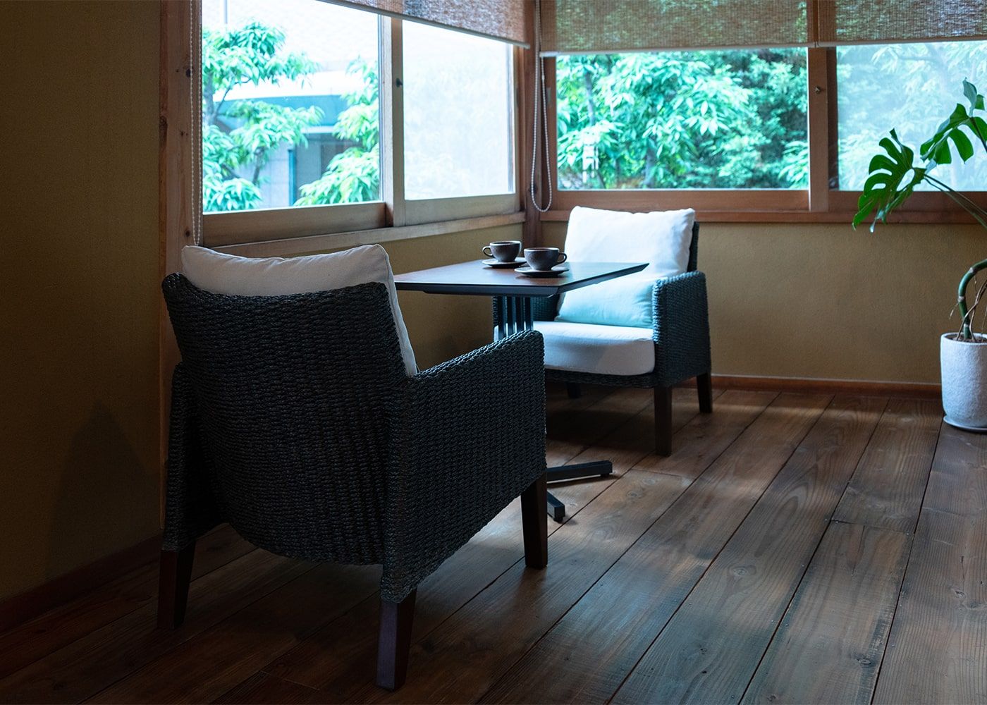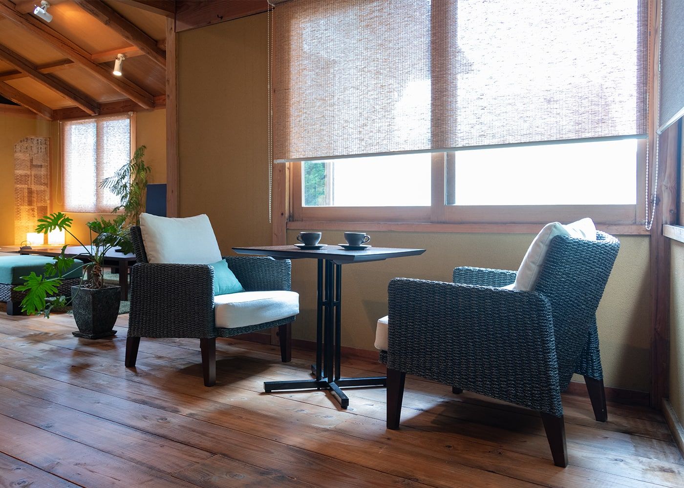 古民家のスタイルに馴染みやすいように、ラタンや無垢材など自然素材の家具を多く取り入れています。温かみを感じながら一息付ける特別感がコーディネートのポイントです。