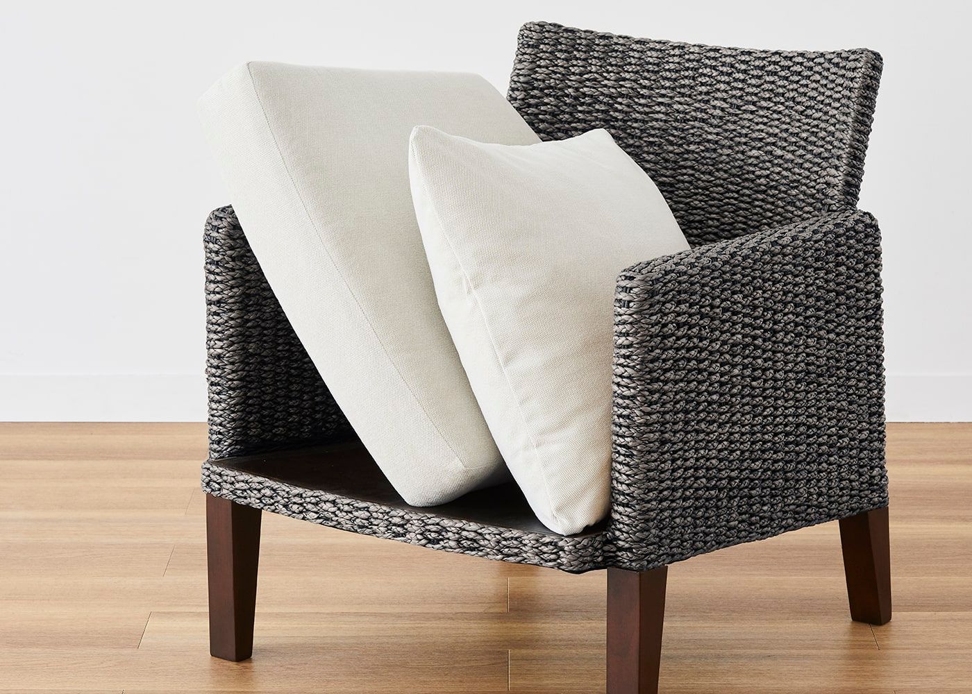 座面よりアームが短い設計や先端にかけて細くなる脚のデザインが軽やかな印象。ヒヤシンス素材の重厚感と抜け感を両立しました。背もたれ側から前に向かって座面幅が徐々に広くなっていく台形状の座面に設計しました。