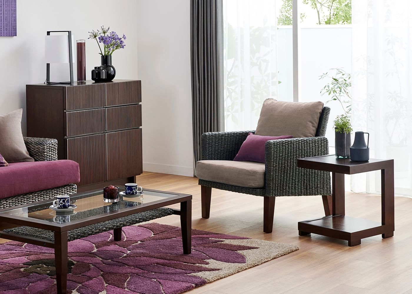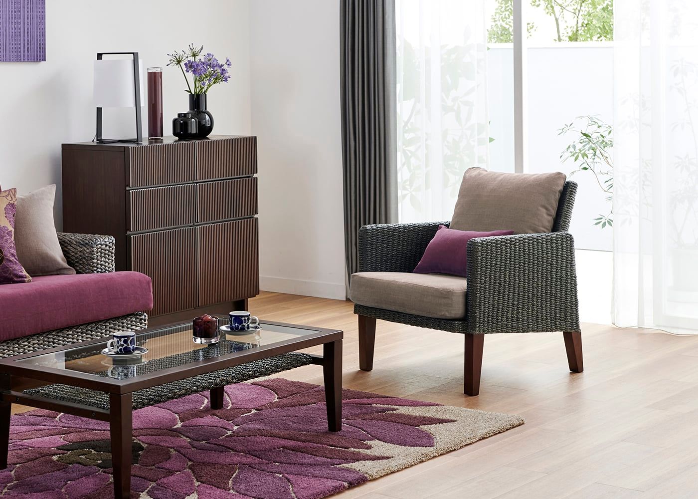 2.5人掛けや3人掛けソファと組み合わせることで、大人数が集まっても楽しめる贅沢なリビングルームに。来客時にはお客様がソファに座り、ご自身はラウンジチェアに座ることでスムーズにおもてなしができます。
