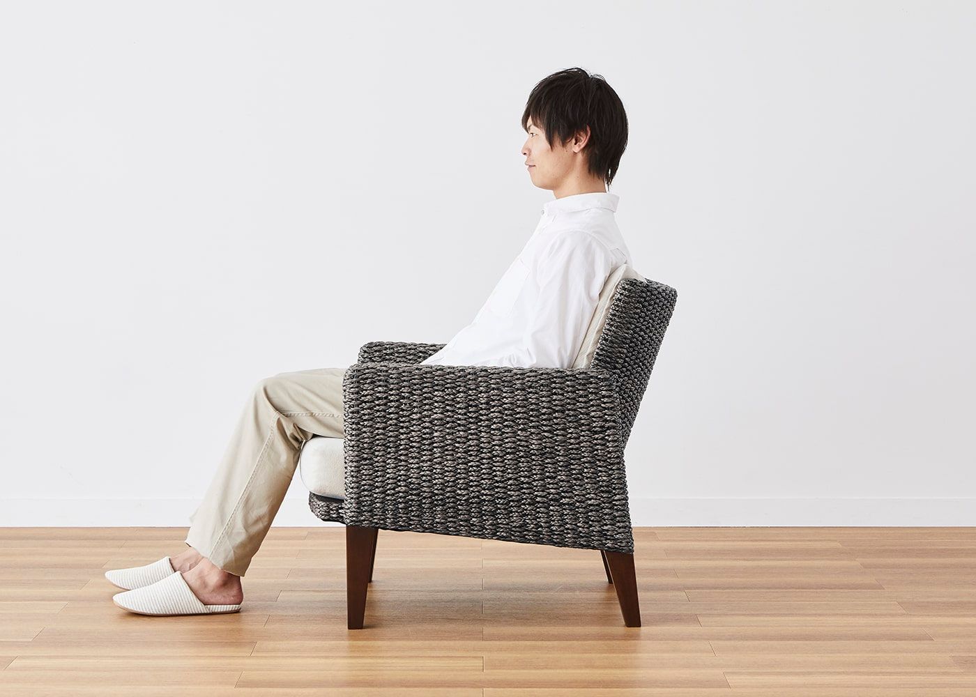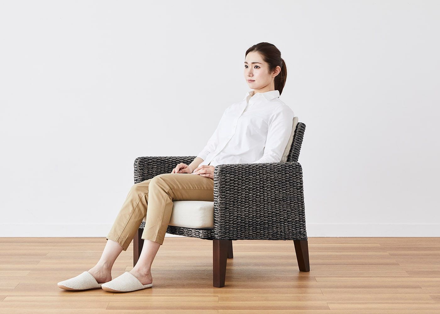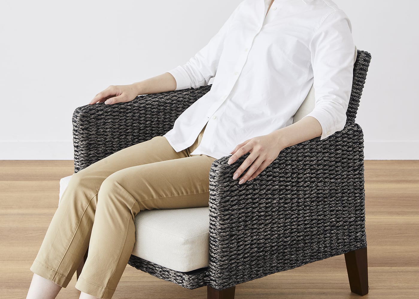 体を安心して預けられる座面と背もたれのボリューム感や包まれるような感触にもこだわり、身体が適度に沈み込む上質な座り心地を堪能できます。また、天然素材ならではの優しい手触りも魅力です。(モデルは身長167cmの女性)