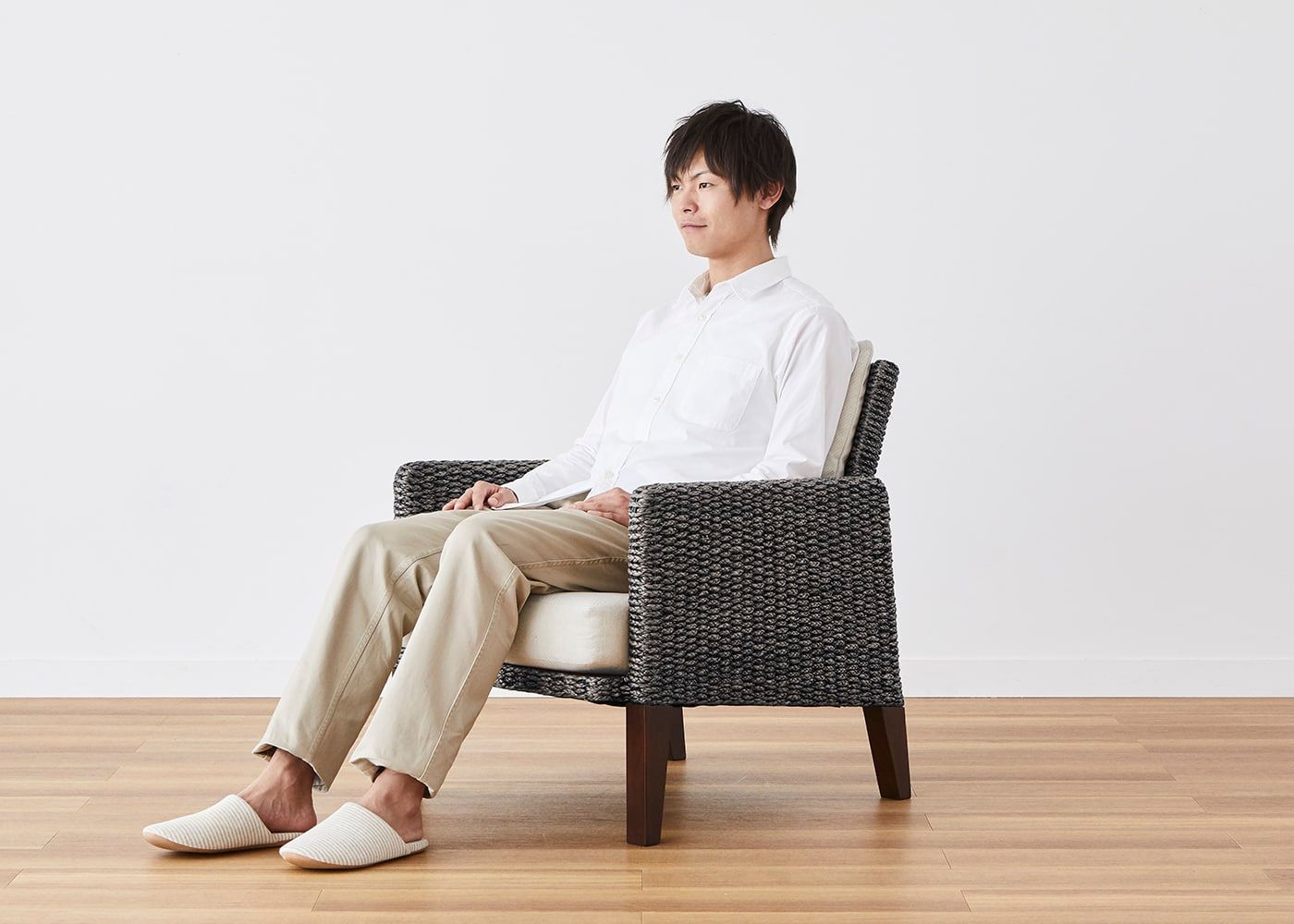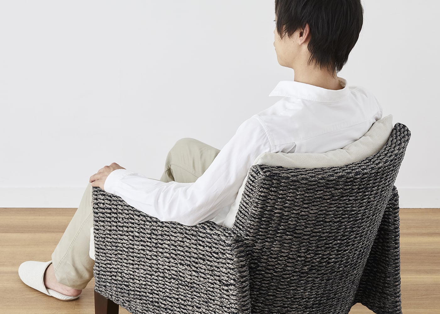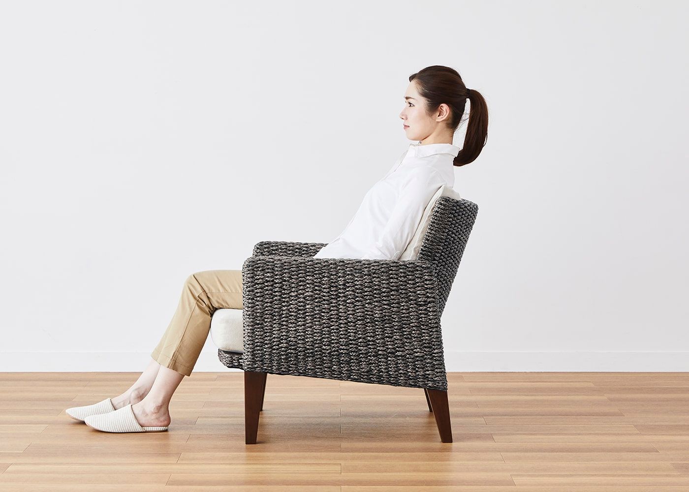 体を安心して預けられる座面と背もたれのボリューム感や包まれるような感触にもこだわり、身体が適度に沈み込む上質な座り心地を堪能できます。また、天然素材ならではの優しい手触りも魅力です。(モデルは身長167cmの女性)