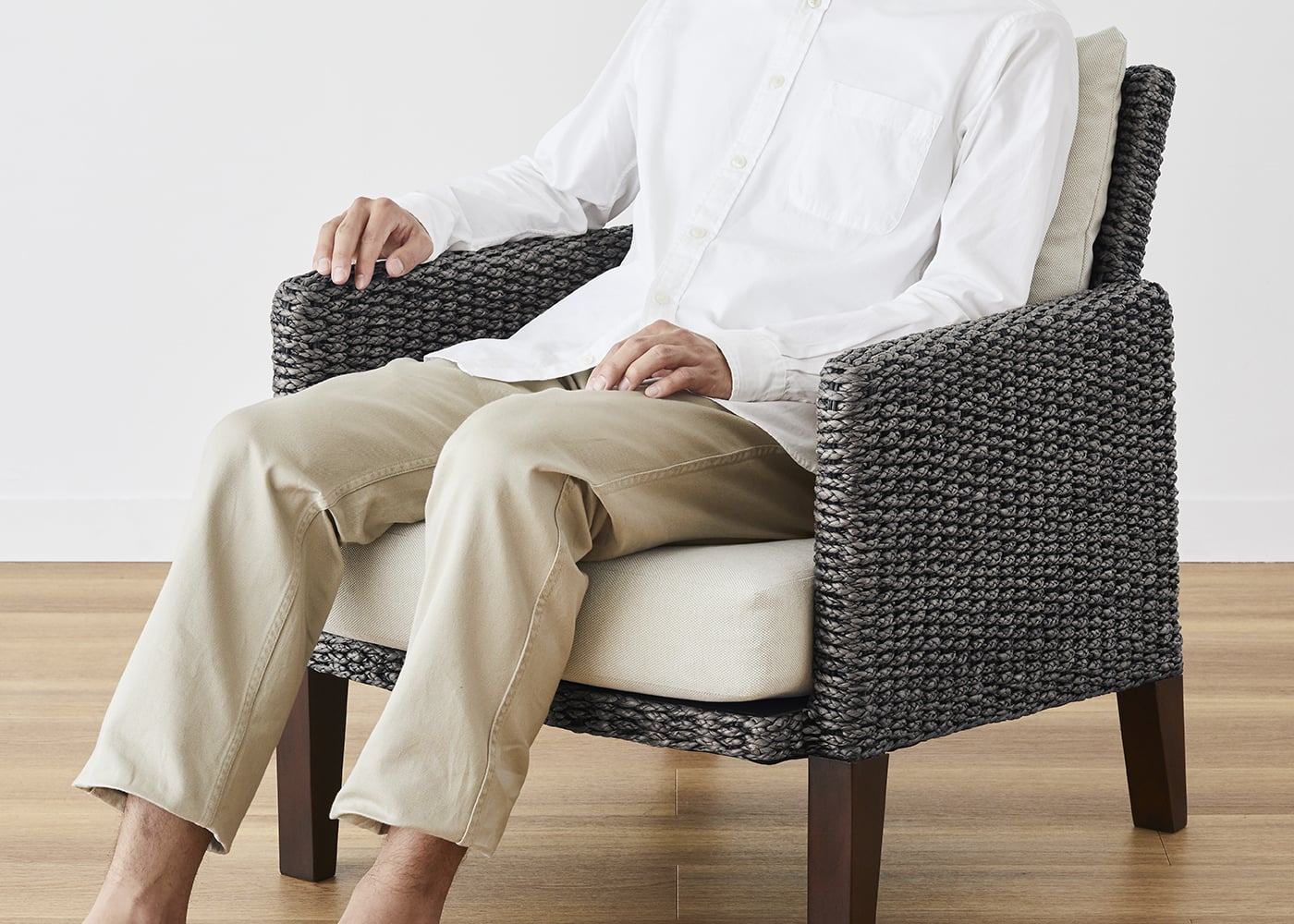 そのため、両側が抜けていないアームチェアでも太もも周りが広く、余裕をもって座れます。肉厚な座面が座り心地の良さを物語っています。(モデルは身長172cmの男性)
