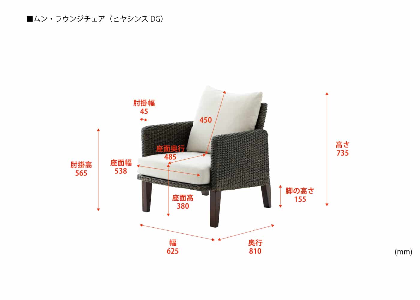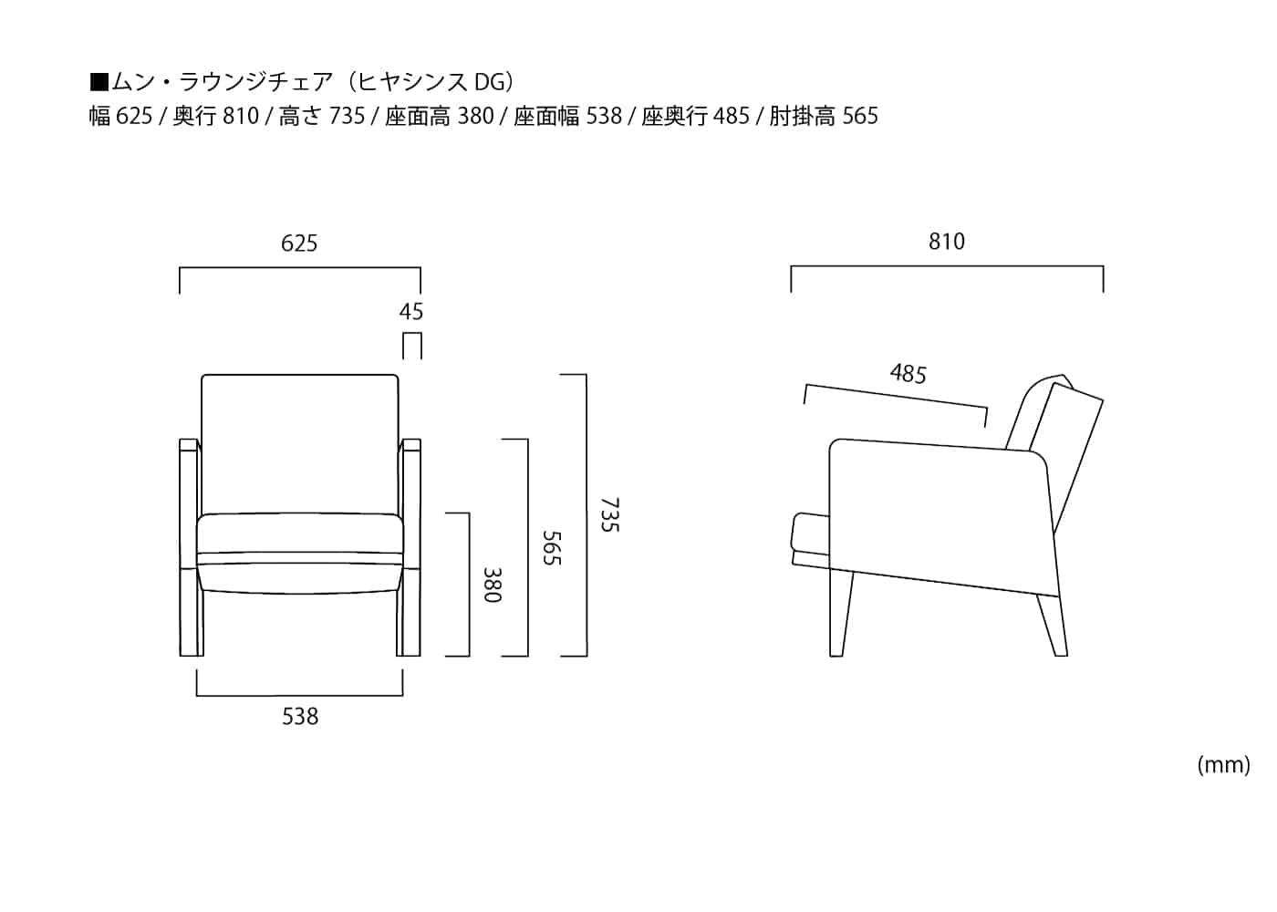 幅625 / 奥行810 / 高さ735 / 座面高380 / 座面幅538 / 座奥行485 / 肘掛高565 ※単位は mm