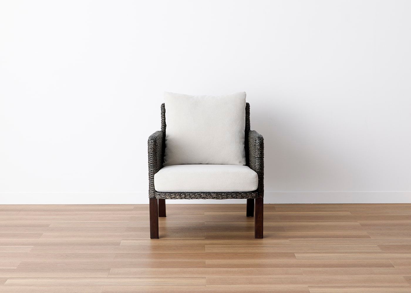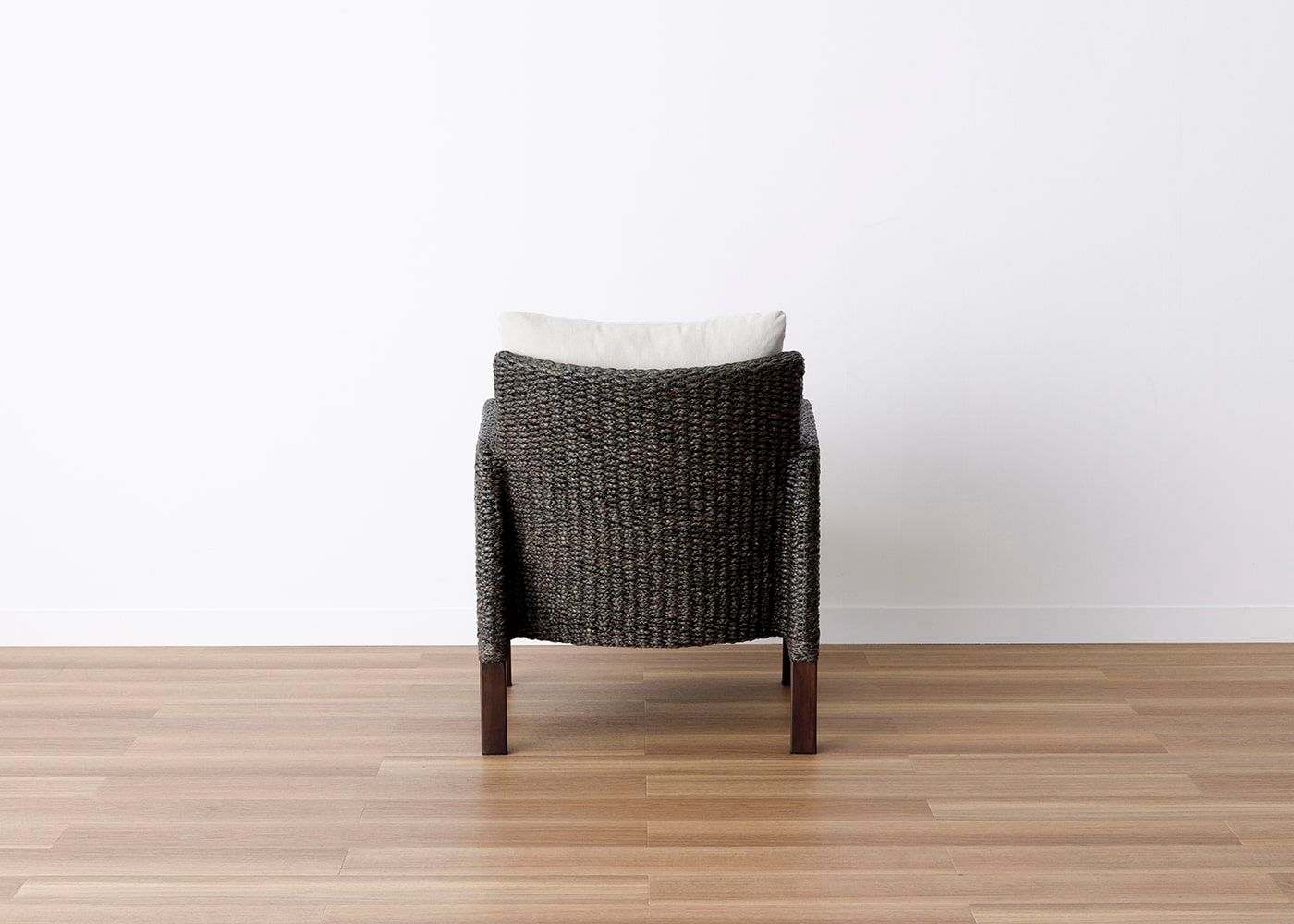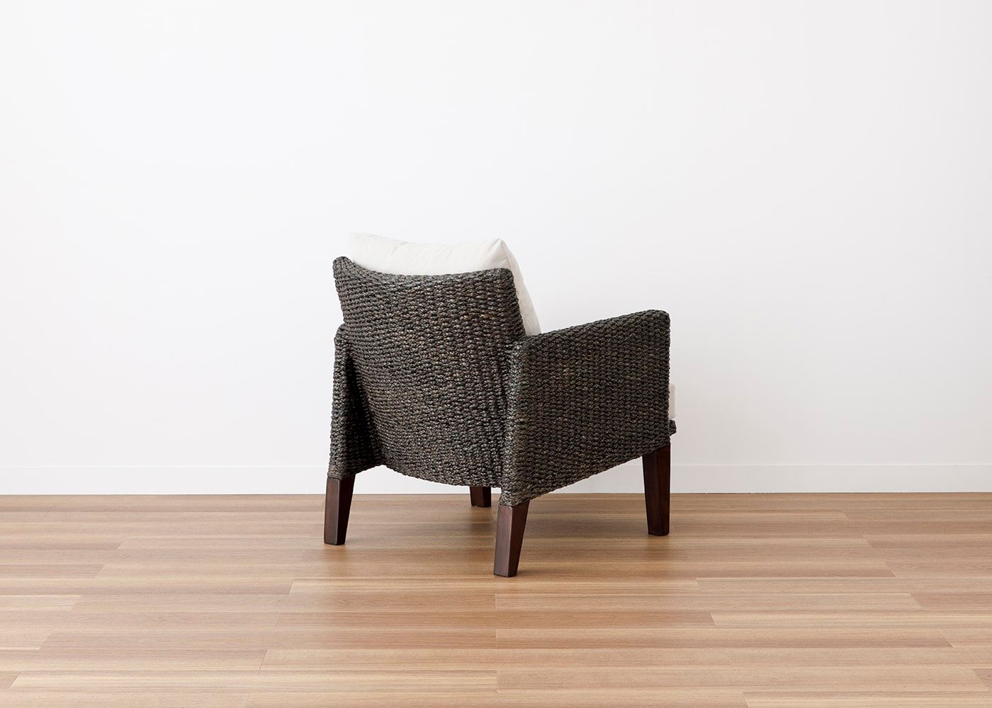 背面からも見ても美しいフォルムのムン・ラウンジチェア。天然素材のヒヤシンスDGらしい直線と曲線のラインが織り成すデザインによって、空間置きしても映えるラウンジチェアです。(写真は