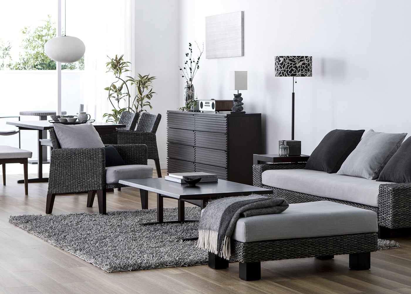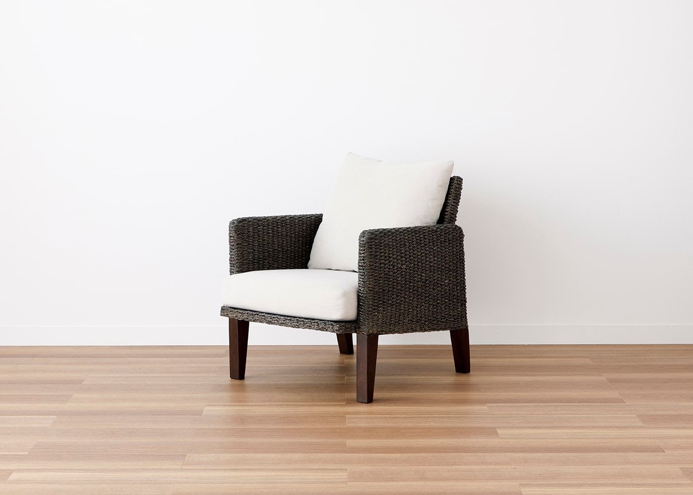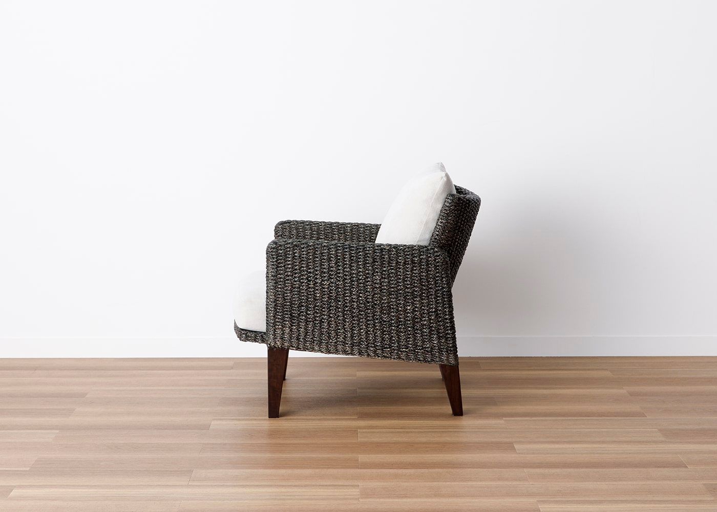 背面からも見ても美しいフォルムのムン・ラウンジチェア。天然素材のヒヤシンスDGらしい直線と曲線のラインが織り成すデザインによって、空間置きしても映えるラウンジチェアです。(写真は