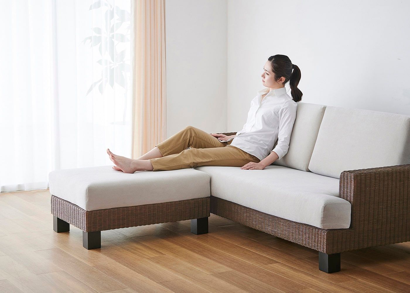 シン・ソファ (ラタンGB)はアームの奥行を短くして、その分座面幅を広くしました。開放的な見た目に加えて、座った際にはゆとりを感じやすく、横になる際は脚を伸ばしやすいなどの便利さも併せ持つソファです。(写真は2.5人掛け)