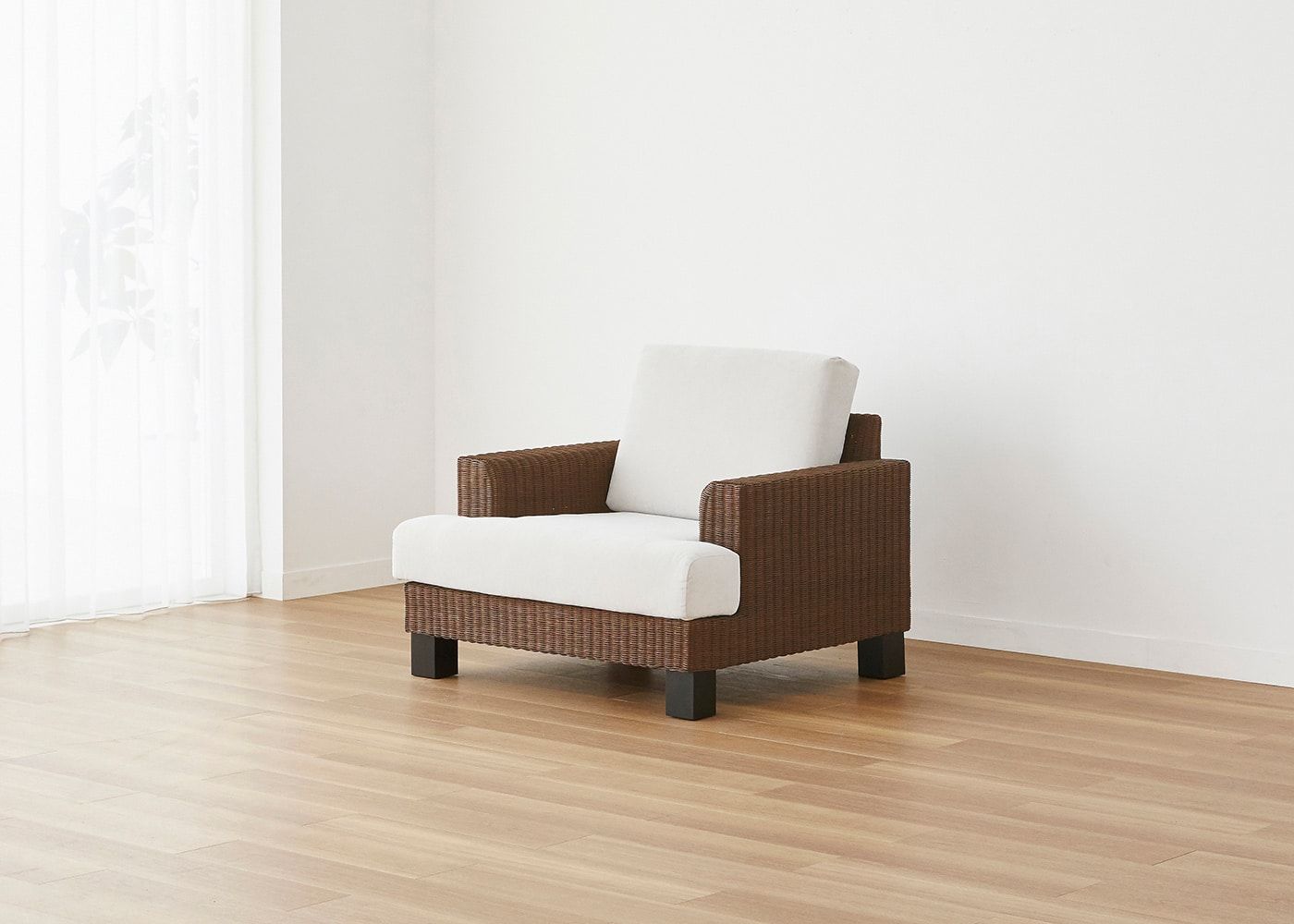 手触りや身体への感触を優しくするため、アームの内側がゆるやかなカーブを描いています。自由に編むことが出来るラタンならではのデザイン性です。奥行きが浅く、丁寧に編み込まれたラタン素材はソファを軽やかに見せ、お部屋を開放的に魅せる抜け感を演出しています。