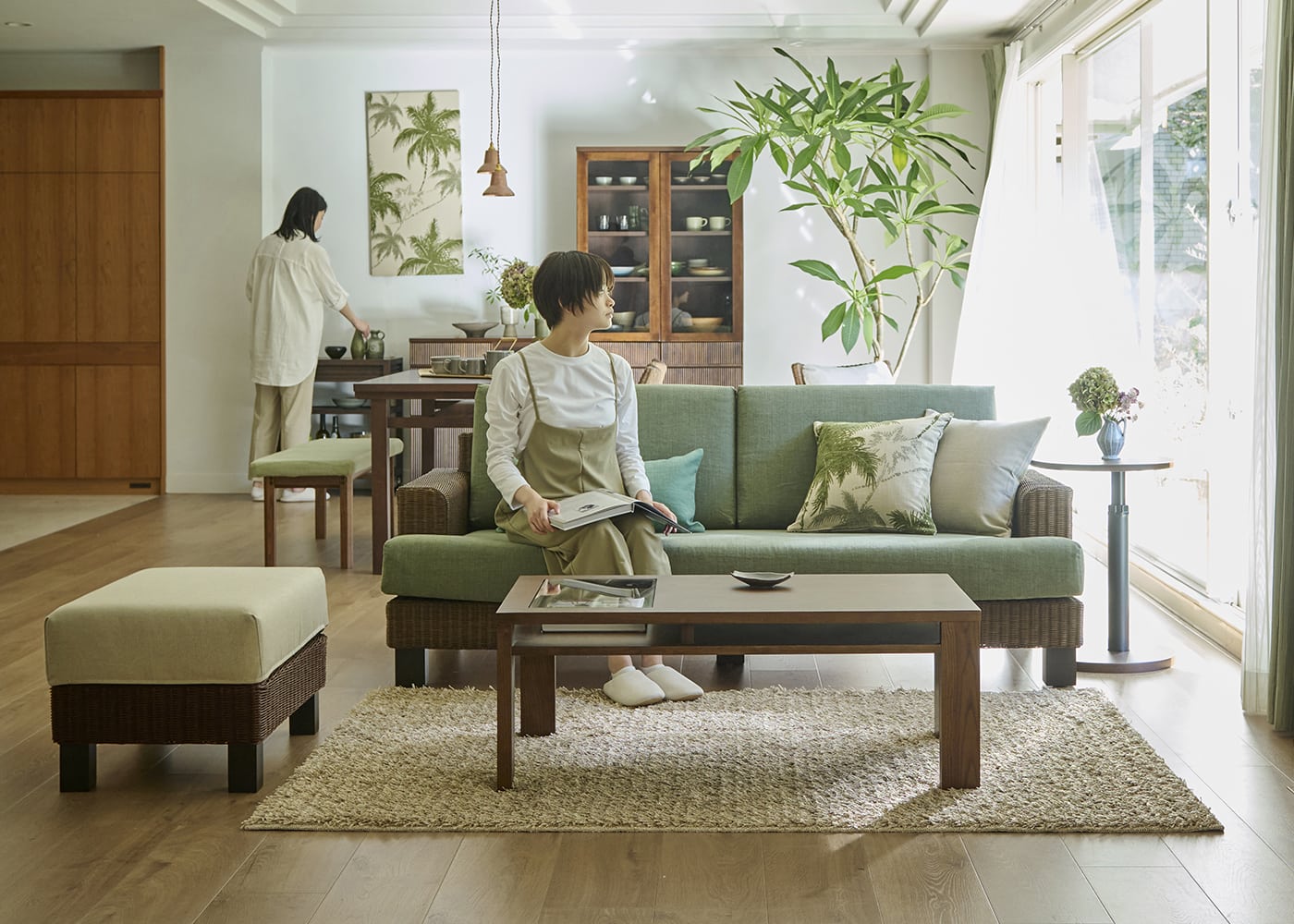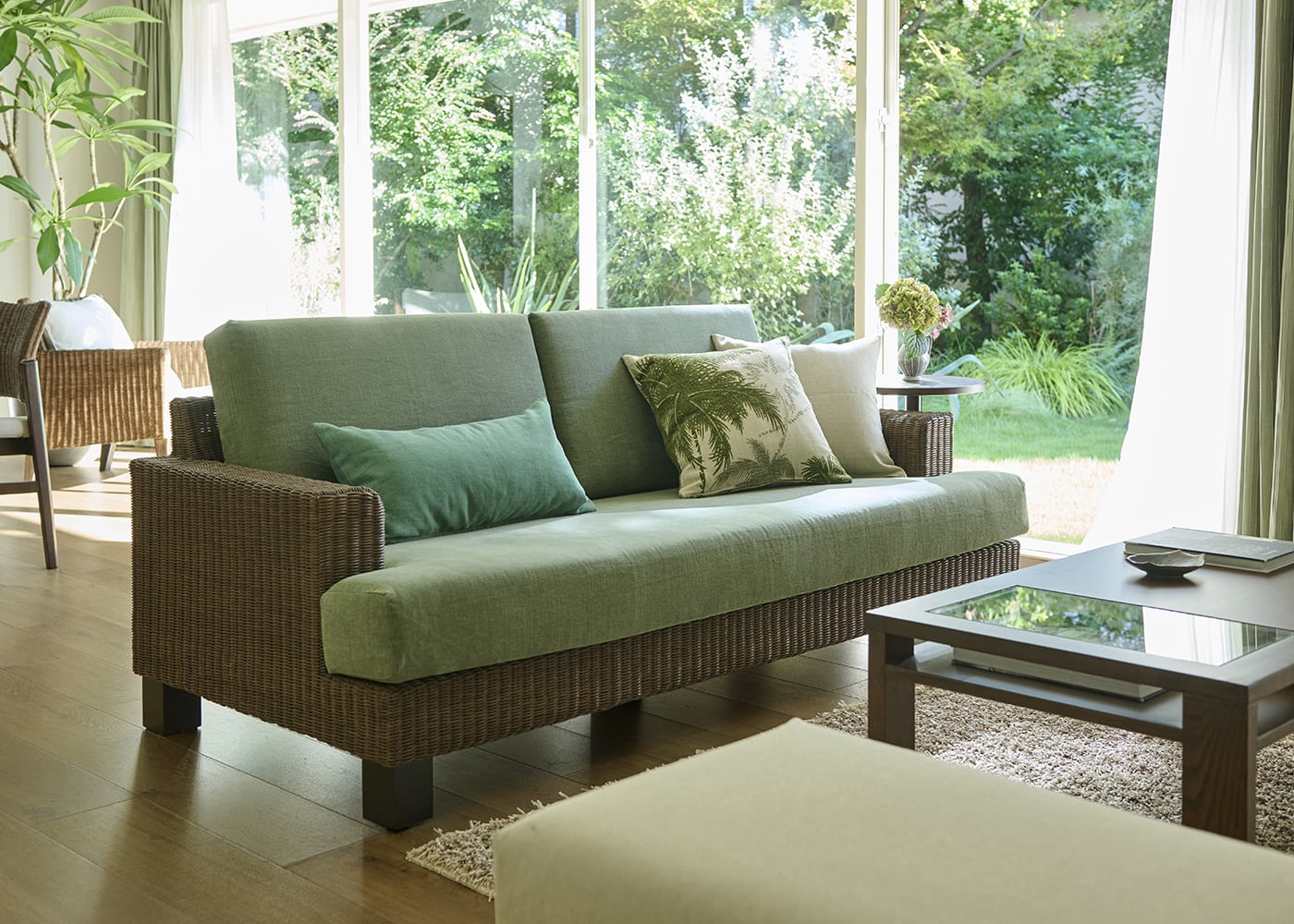 シン・ソファ(ラタンGB)と、穏やかな色合いのCLハーブのソファカバーが美しく調和します。まるで、木漏れ日が差し込む自然に包まれているような柔らかい雰囲気を演出し、くつろぎの時間を満喫できます。