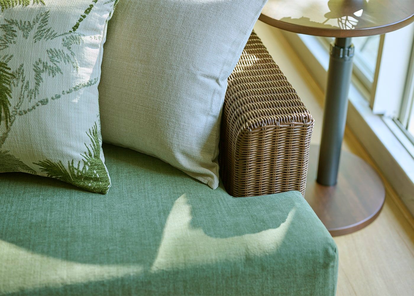 ハーブグリーンのソファには、ヤシ柄や鮮やかな緑色のクッションが映えます。それらに落ち着いたベージュのクッションを加えることで、洗練されたバランスのある空間に。色と柄の組み合わせで、お部屋に自然な温もりとスタイリッシュさを演出しましょう。≫ファブリック一覧はこちら