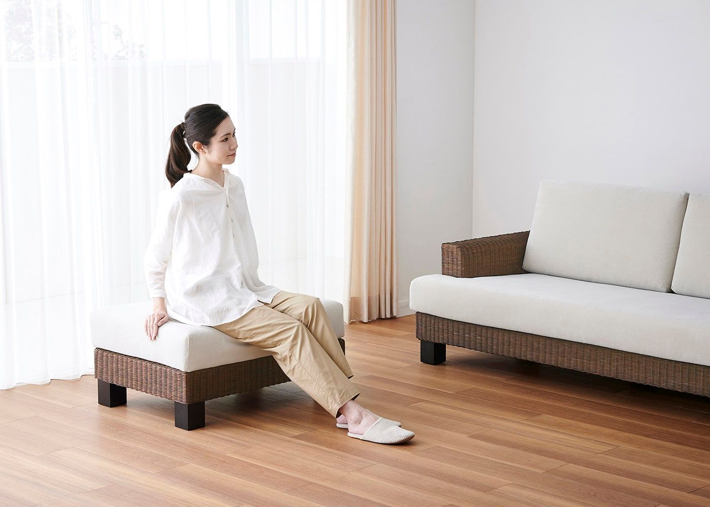 来客時には、ご自身が座るスツールとしても使えます。いろいろな使い方ができるため、オットマンが一つあるだけで暮らしが豊かになるでしょう。ボリューム感のあるクッションがしっかり体を支え、快適な座り心地を実現しています。座面は手を付けるほどのゆとりがあるワイドタイプです。(モデルは身長167cmの女性)
